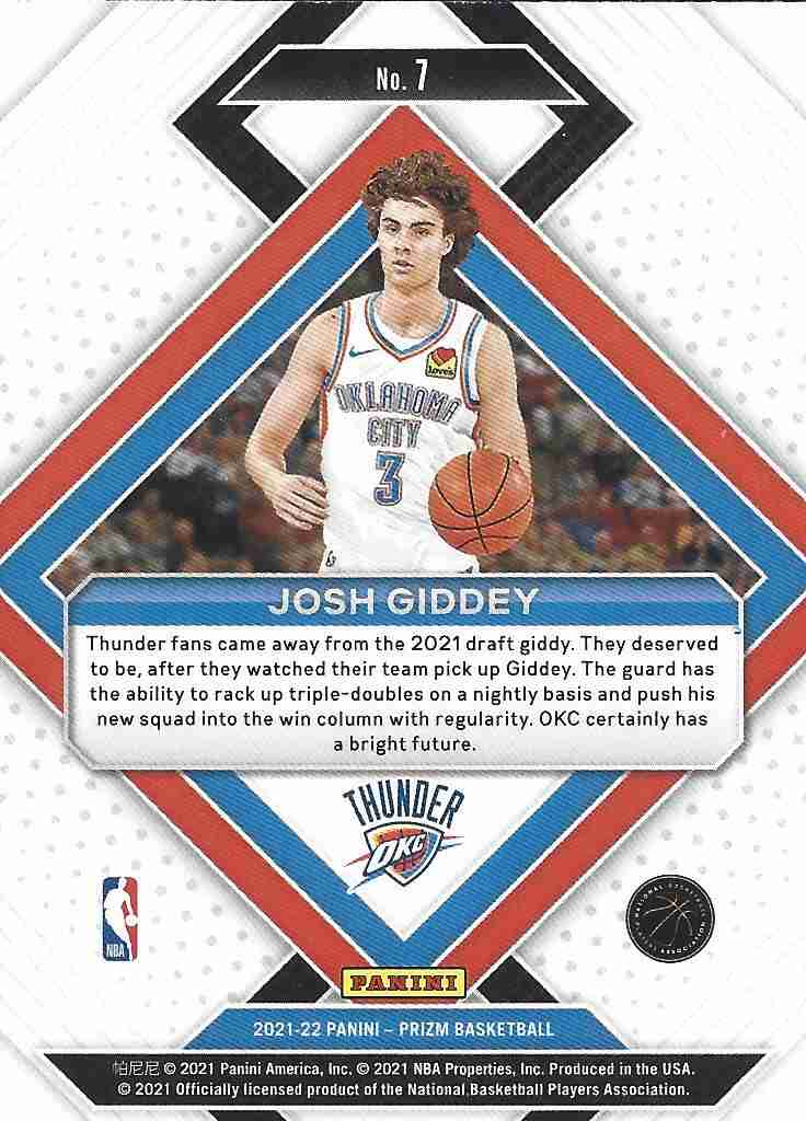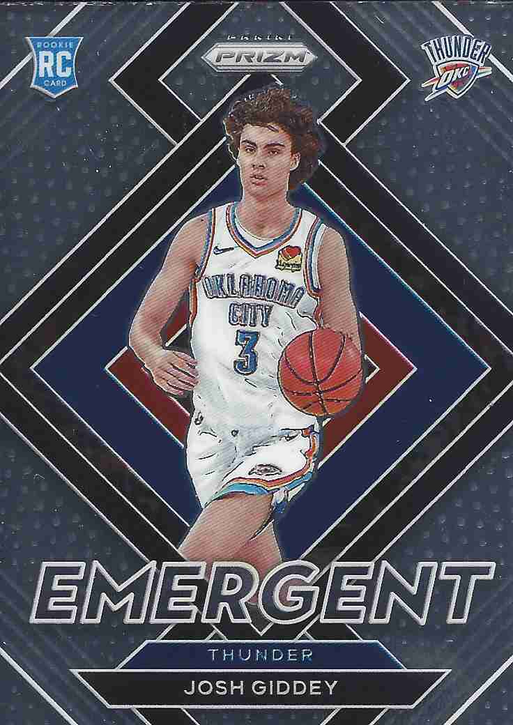 2021-22 Panini Prizm Emergent Insert Rookie Card (#7) of the Oklahoma City Thunder standout Josh Giddey.