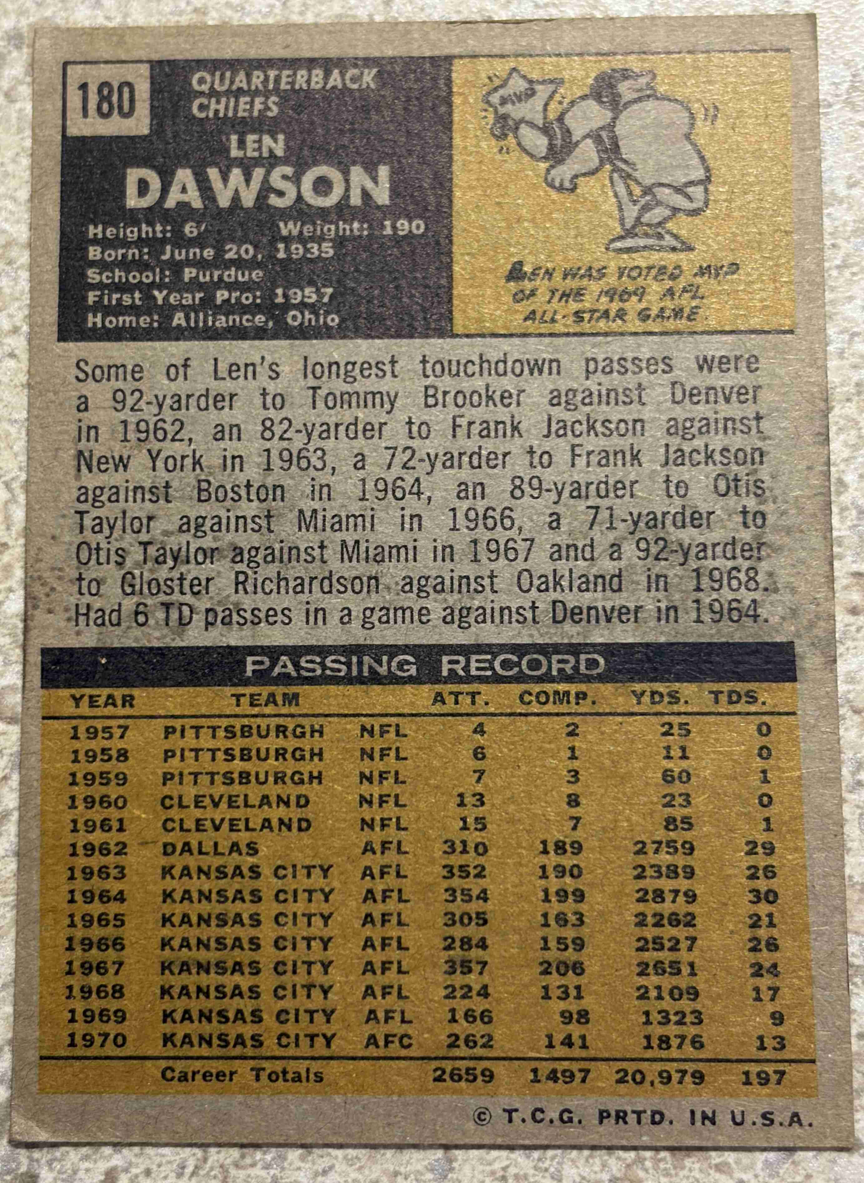 1971 Topps Len Dawson #180 EXC condition Shipped in PWE