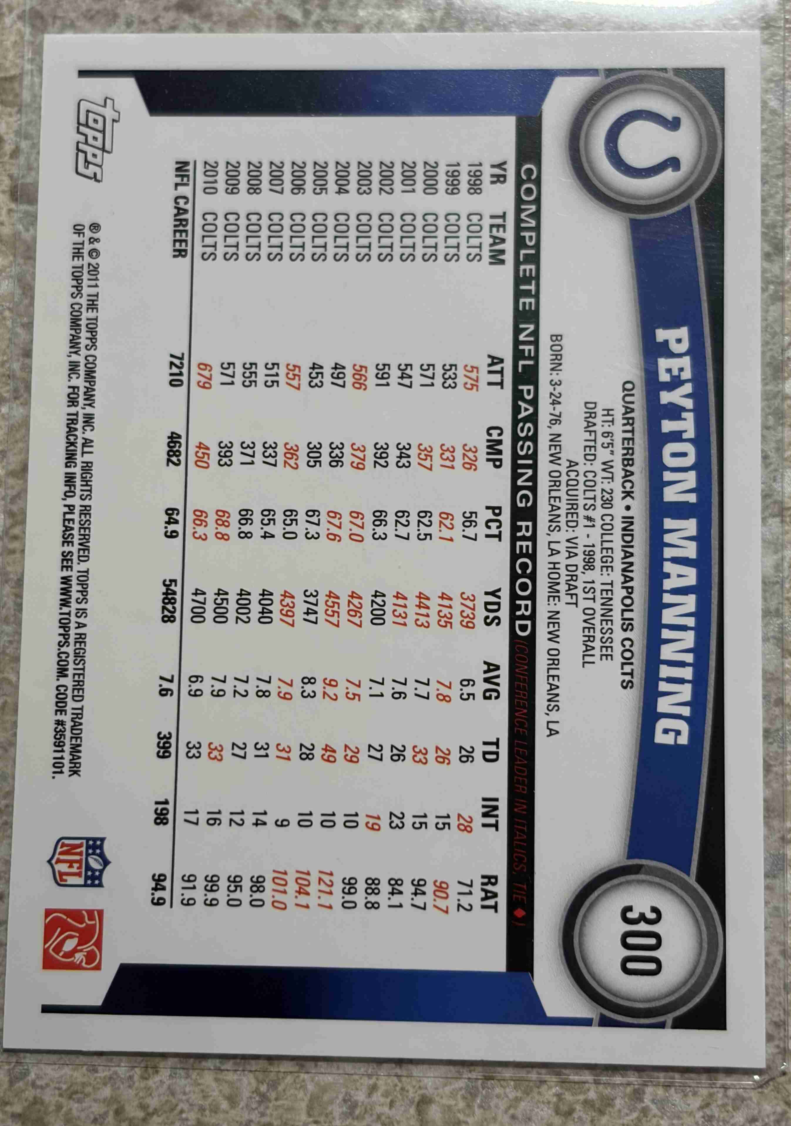 2011 Topps Peyton Manning #300 Indianapolis Colts HOF NRMT Shipped in PWE