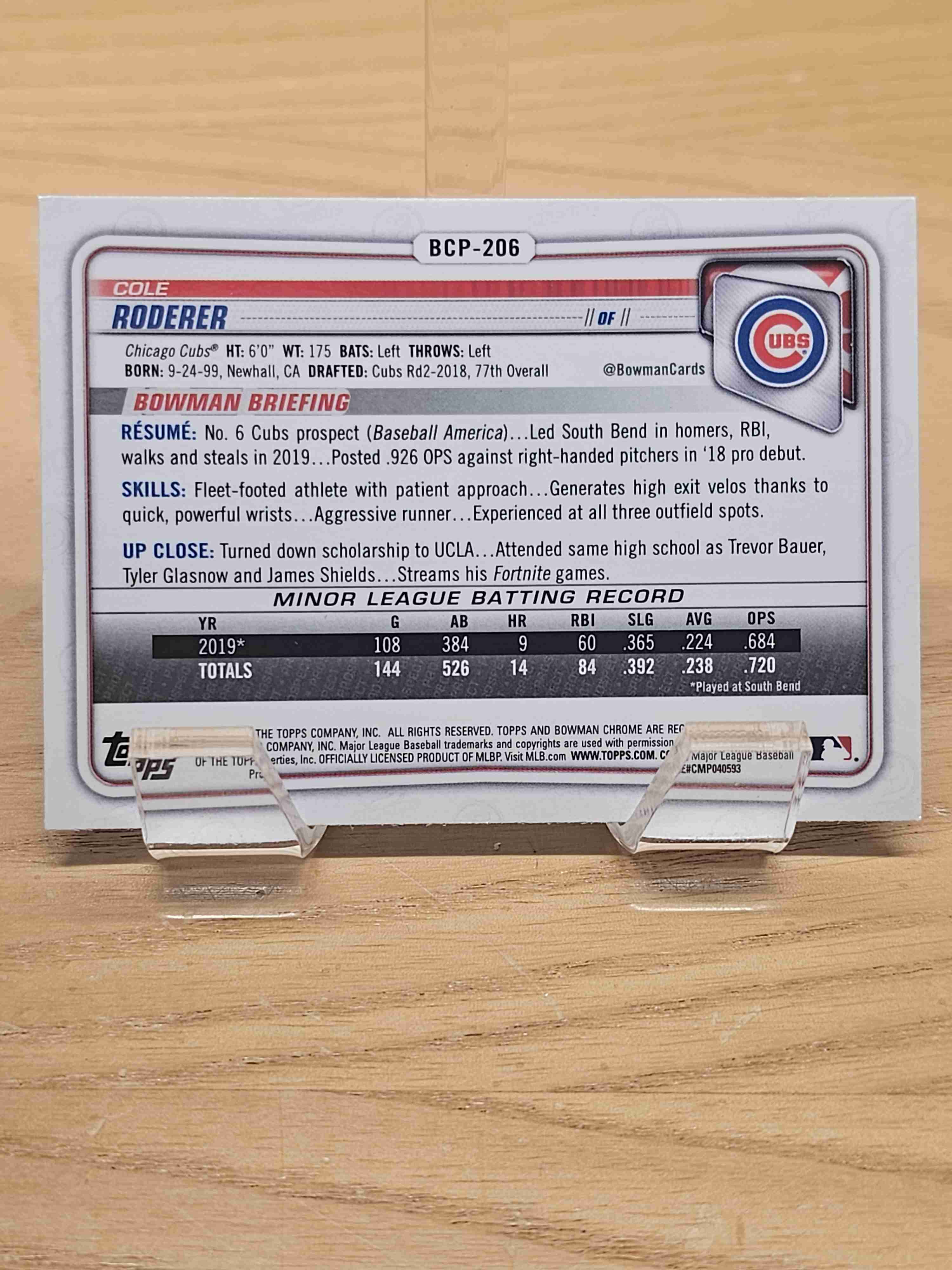 2020 Bowman Chrome Baseball Bowman Chrome Prospects Cole Roderer Chicago Cubs Card #BCP-206