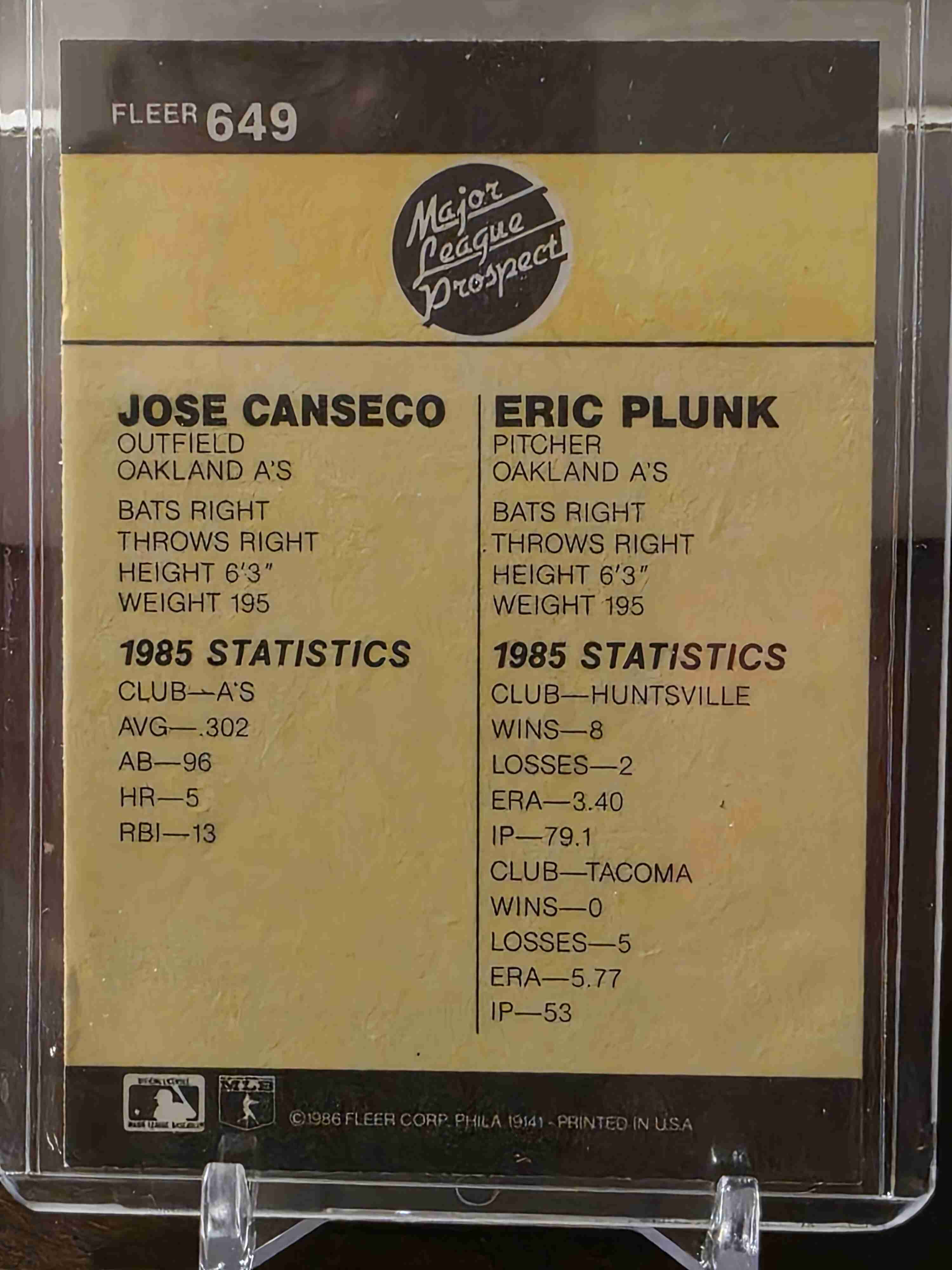 The 1986 Fleer Jose Canseco and Eric Plunk #649 trading card is a valuable collectible featuring two popular Major League Baseball players from the Oakland Athletics team. This rookie card is part of the base set released by Fleer in 1986, making it a sought-after item for baseball card collectors. With its excellent condition and ungraded status, this sports trading card captures a piece of baseball history and is a must-have for fans of the sport.