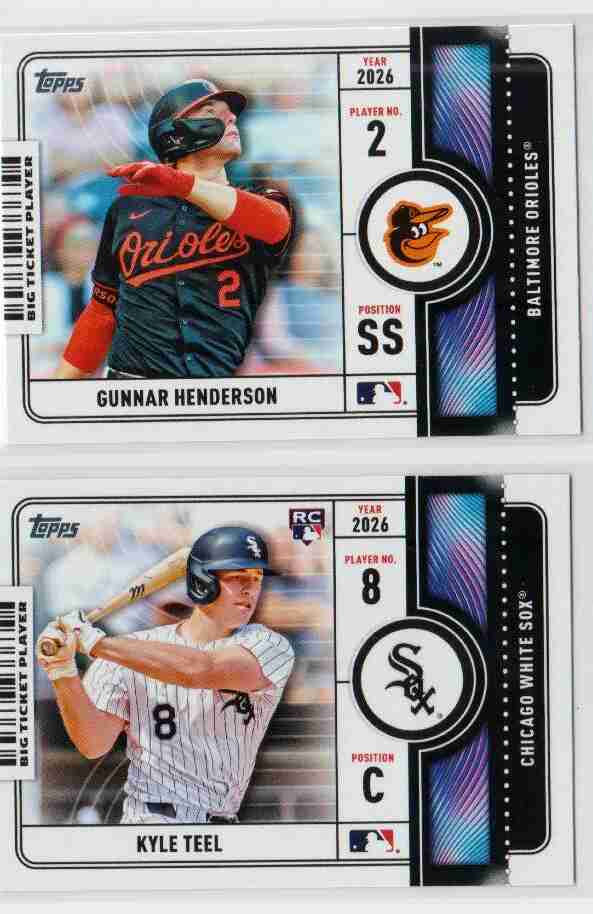 Please take a look at the photos for details on the cards' condition. The cards you are bidding on are the cards pictured. This auction is for 2 2026 Topps Series 1 Big Ticket inserts. They are Gunnar Henderson and Kyle Teel. You can use your judgment on the grade of the cards. If you have any questions or require more detailed photos, please don't hesitate to ask. Note: The shipping price shown is for PWE. The card will ship with a tracking number if the final auction price exceeds a certain dollar amount (or if it is combined with the appropriate number of other completed auctions). Otherwise, the card will be shipped PWE. Thank you!