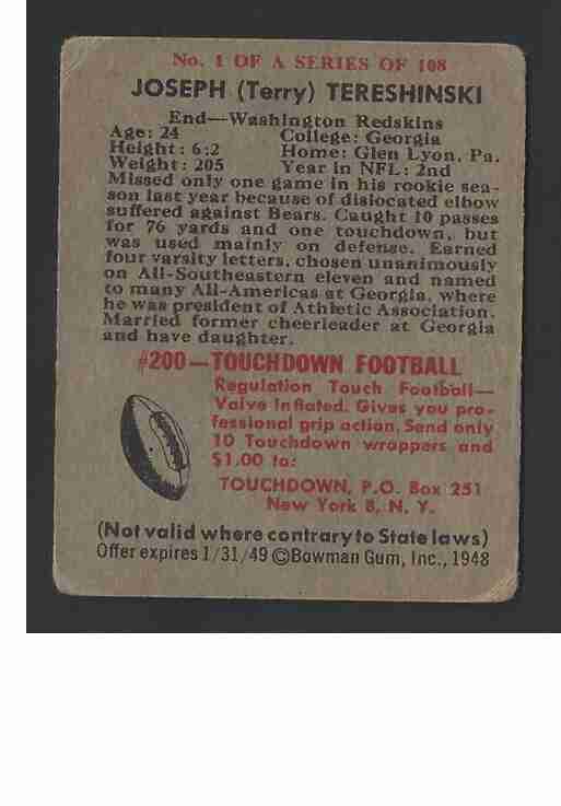 1948 Bowman Joe (Terry) Tereshinski (RC) -#1- Redskins. Lower-grade card - corner wear. Card shows nice for this era. Ships no tracking. Please review scans carefully for condition.