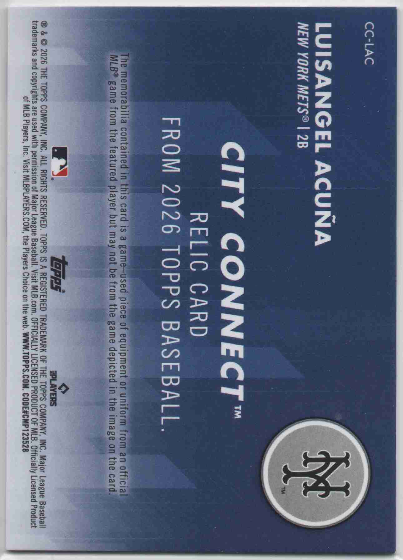 Luisangel Acuna 2026 Topps City Connect Game Used Jersey