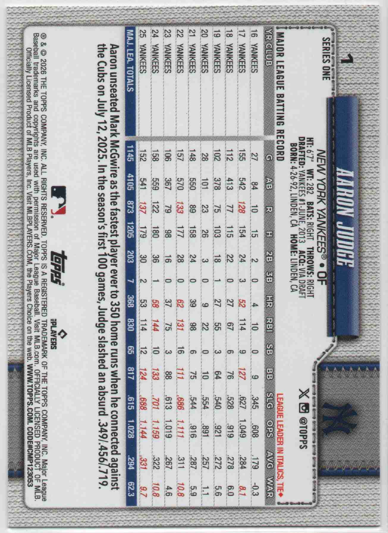 Aaron Judge 2026 Topps Series 1 #1 Diamante Parallel SP