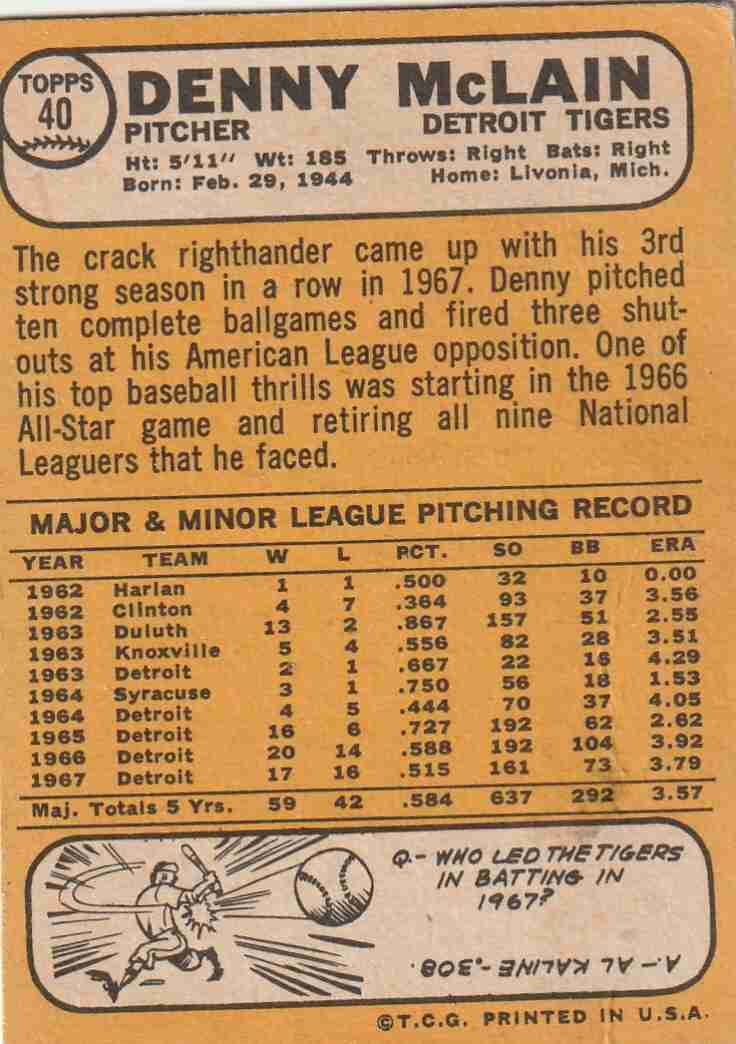 1968 Topps #40 Denny McLain Tigers