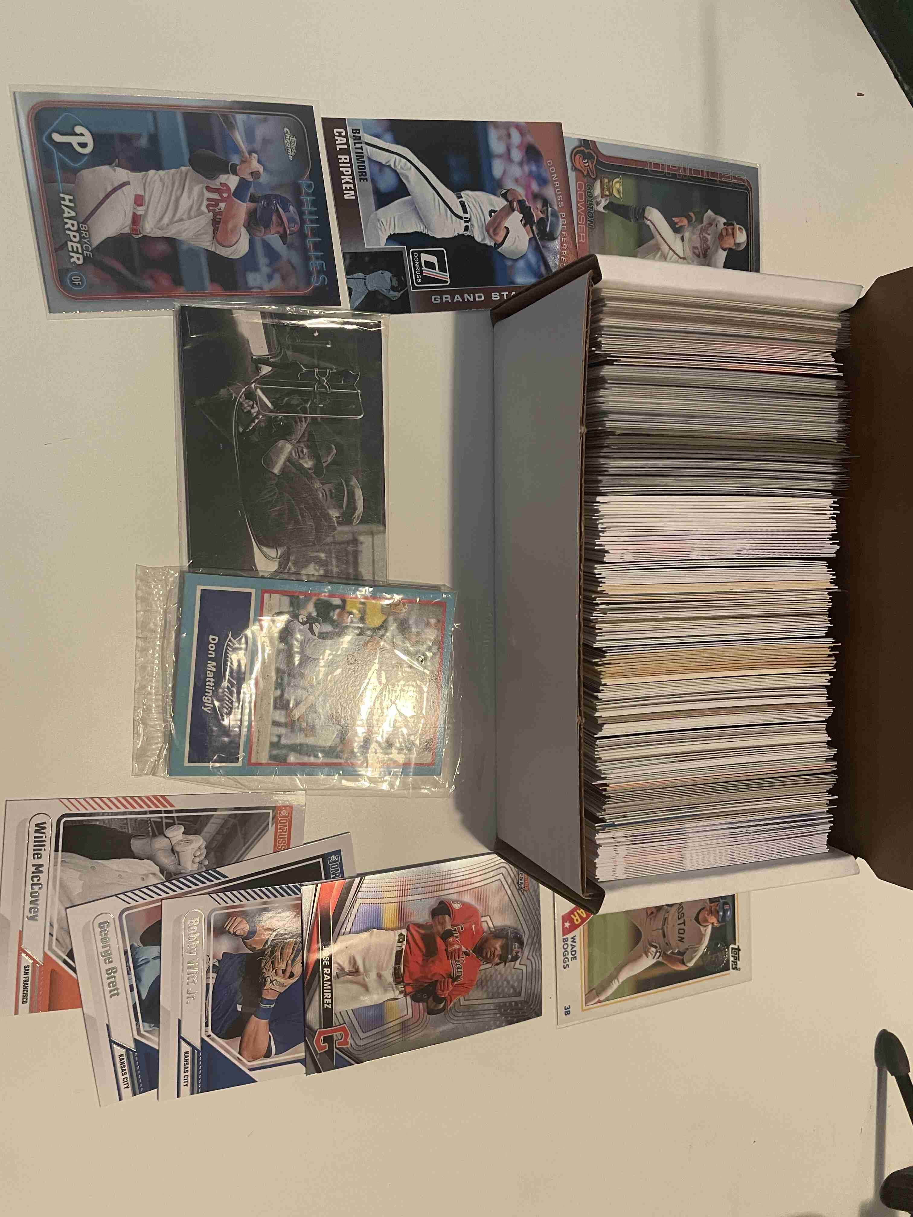 400 count box full, some penny sleeved. Includes 2 sealed packs. One of Babe Ruth and the other of Don Mattingly. Years are mostly newer (last 5 years) but does have some from the 80's too. Thanks for looking.