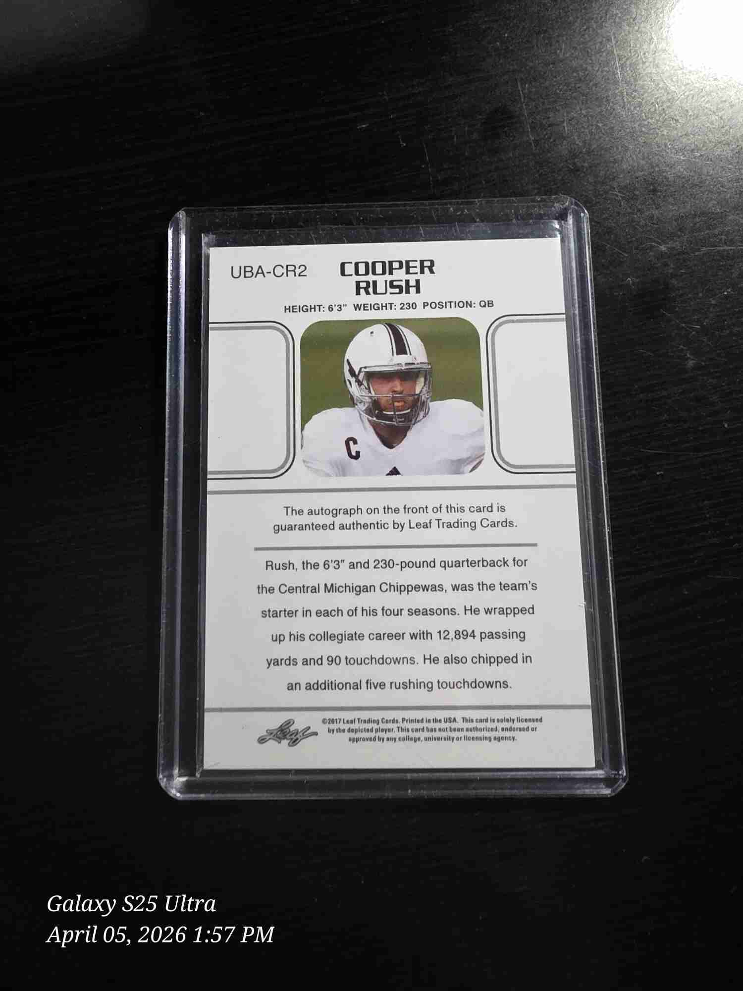 2017 Leaf Ultimate Draft 1990 Leaf Auto Cooper Rush #UBA-CR2 Rookie Auto RC. Card is in Nr-Mt condition.
