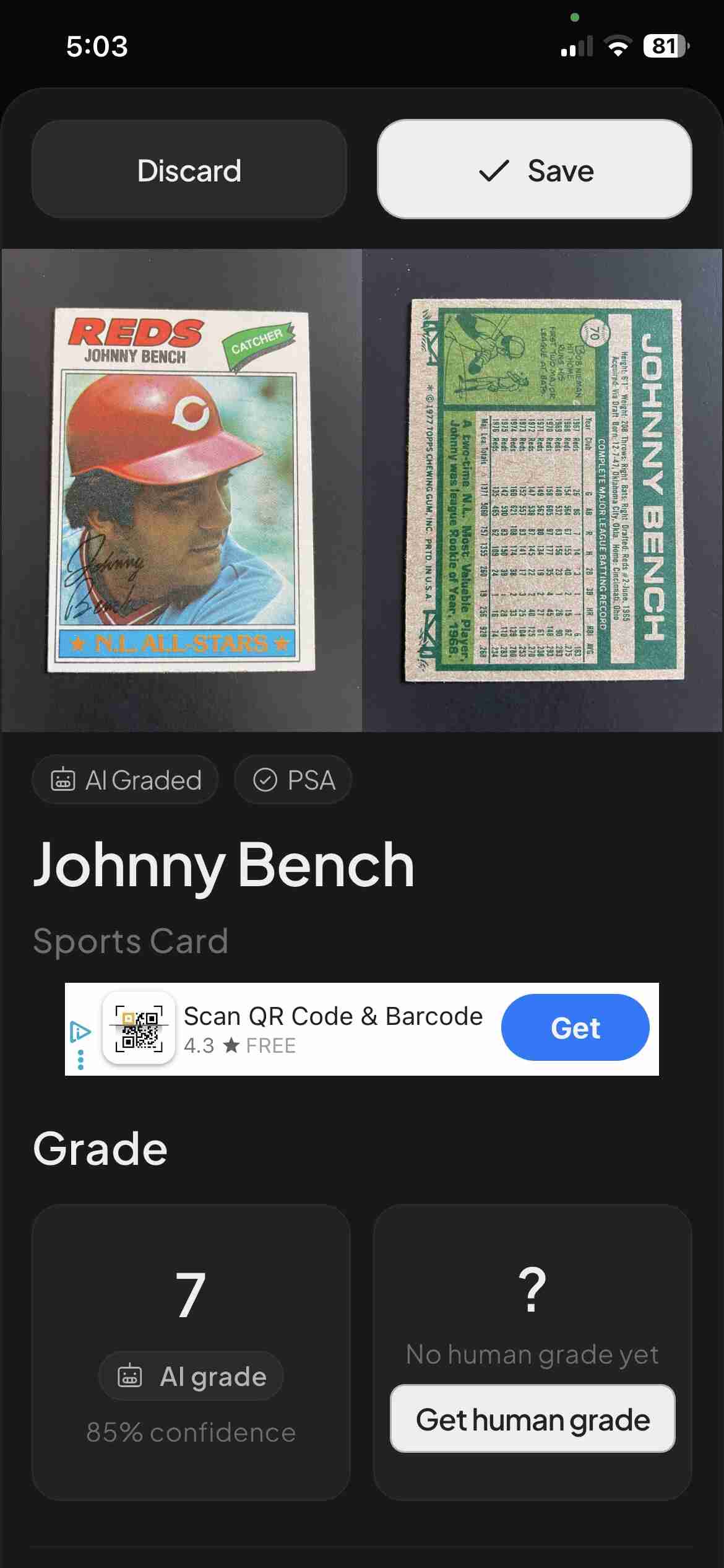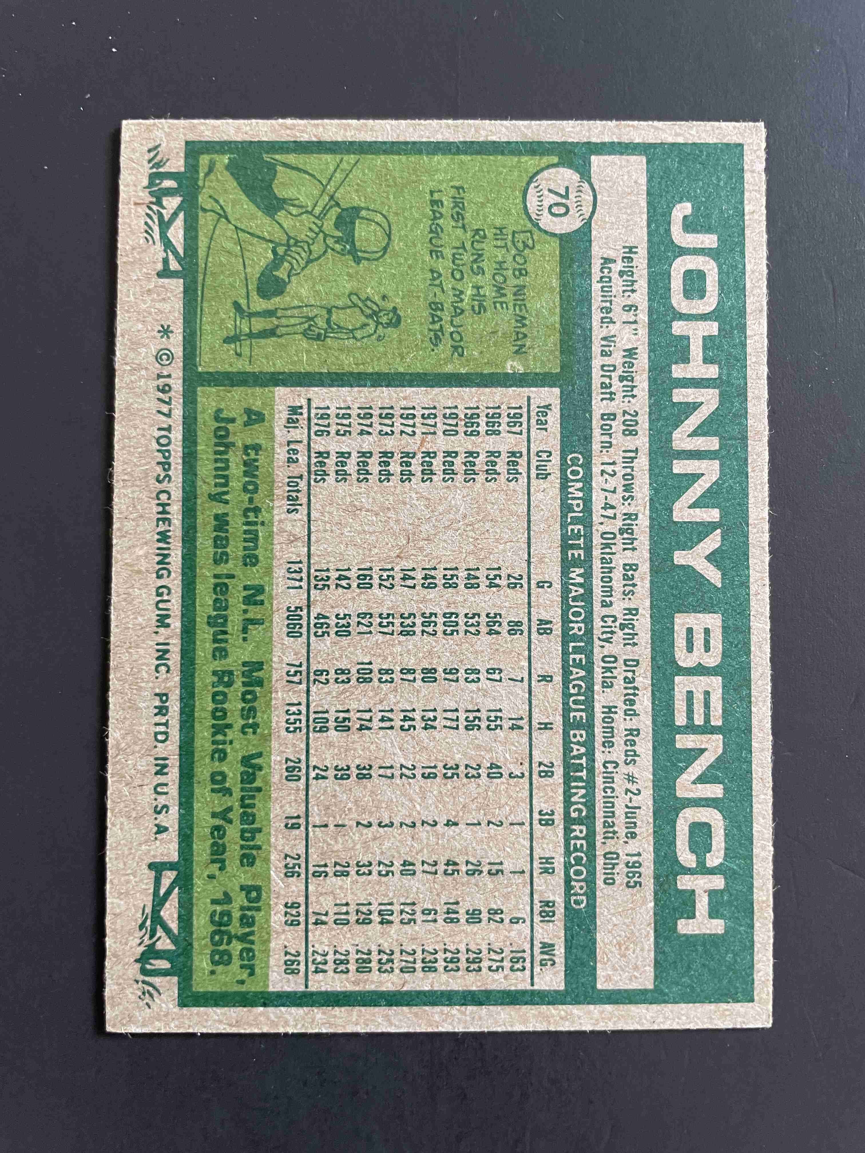 1977 Topps Johnny Bench #70 - Grade: 7 (AI)