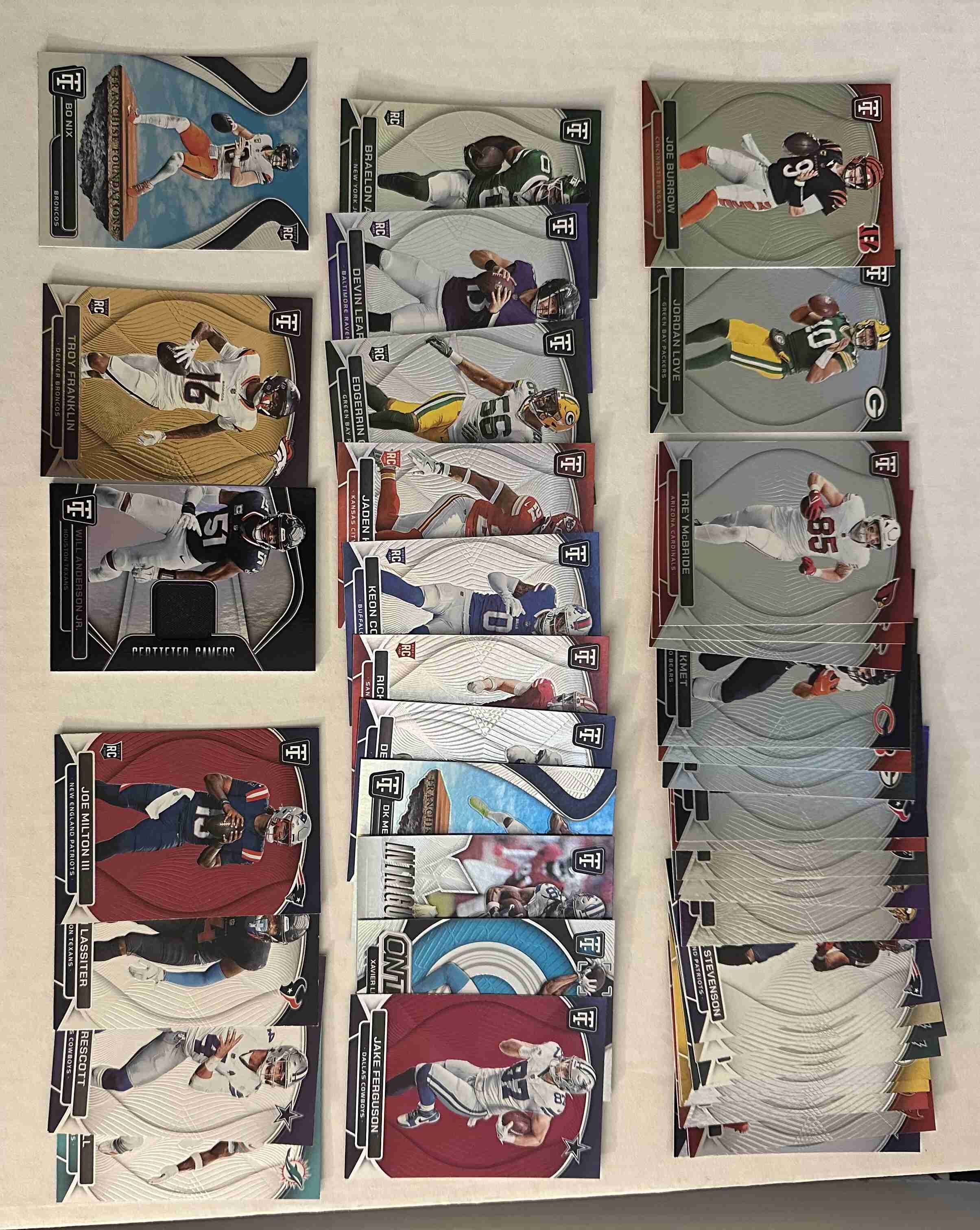 3, 4, 5, 16, 17, 20 (Burrow), 21, 30 (Love), 31, 35, 45, 46, 47, 58, 59, 62, 63, 73, 74, 77, 78, 87, 88, 100, 106 (Allen RC), 120 (Leary RC), 123 (Cooper RC), 129 (Hicks RC), 152 (Coleman RC), 163 (Pearsall RC), 194. Inserts: Franchise Foundations Nix 15, 18. Intriguing Player Lamb. On Target Legette. Red Joe Milton. Troy Franklin 170 213/399. Certified Gamers Will Anderson GU.