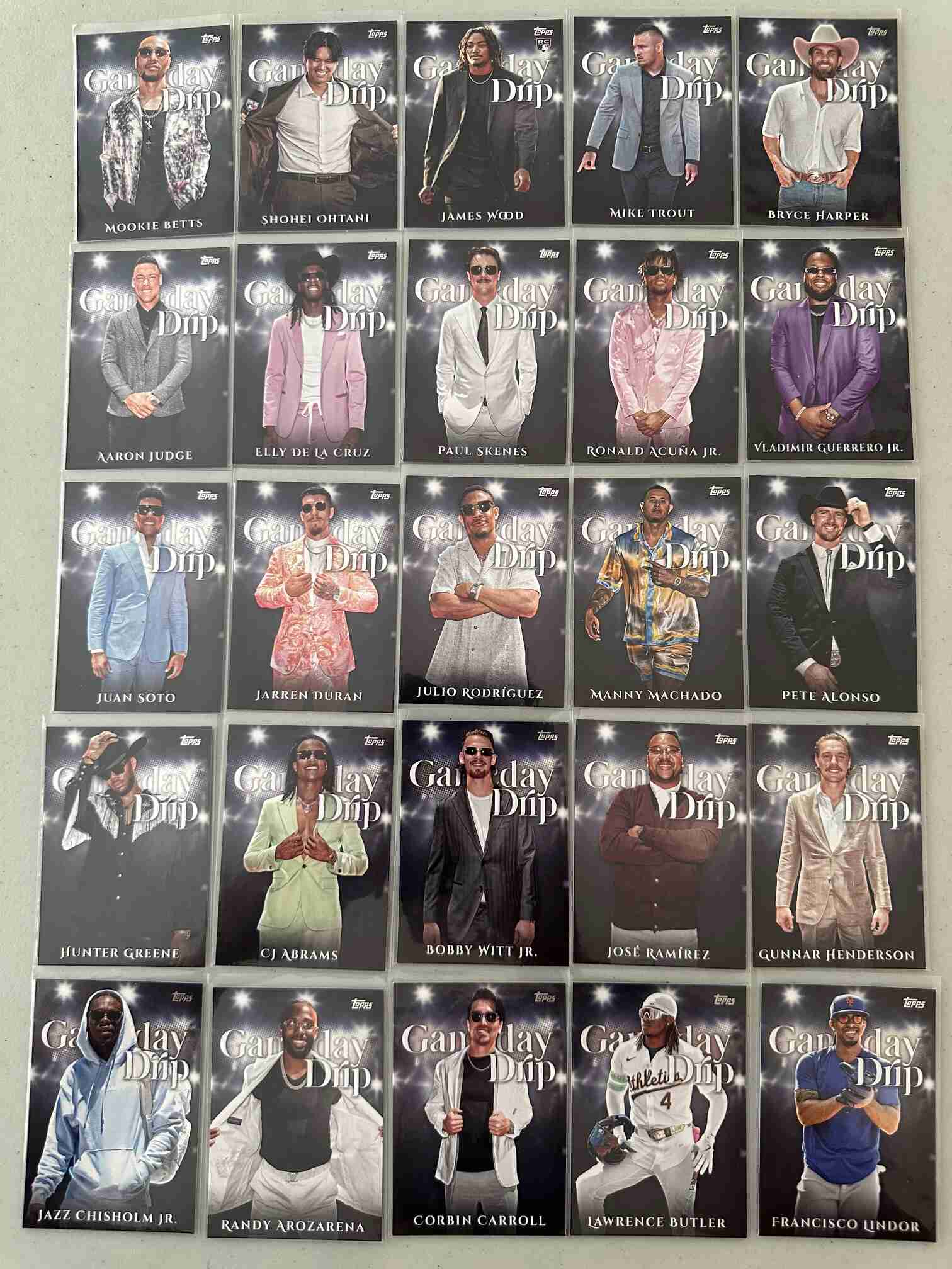 This is last year's (2025) Celebration Gameday Drip Insert set. Has cleaned up fellas in suits and cowboy hats like Skenes, Ohtani and Judge. I have other auctions running now for the other sets from 2025 Celebration Megas. If you ripped too much series 1 last year and want to pick these up to complete your master set, or just like how they look, check my other listings, please! Last pic shows the whole set.