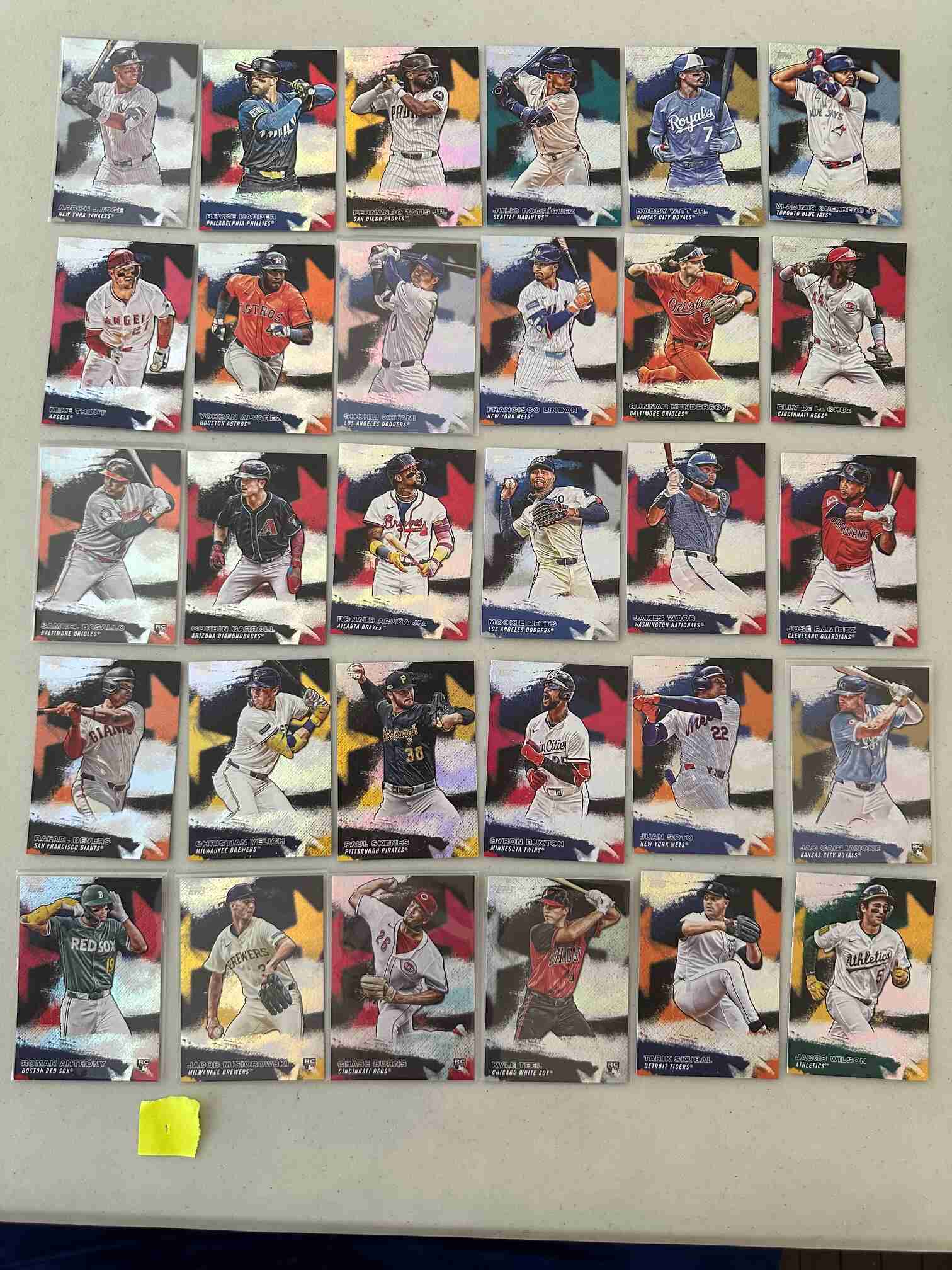 2026 Topps Series 1 Stars of MLB insert set. This has some great rookies in it; Roman Anthony, Jacob Misiorowski, Samuel Basallo and Jac Caglianone. Plenty of good vets and other rookies as well. Ohtani and Judge are in here. I have other auctions running now from 2025 and 2026 Topps Baseball sets. If you want to pick these up to complete your master sets, or just like how they look, check my other listings, please! Last pic shows the whole set.