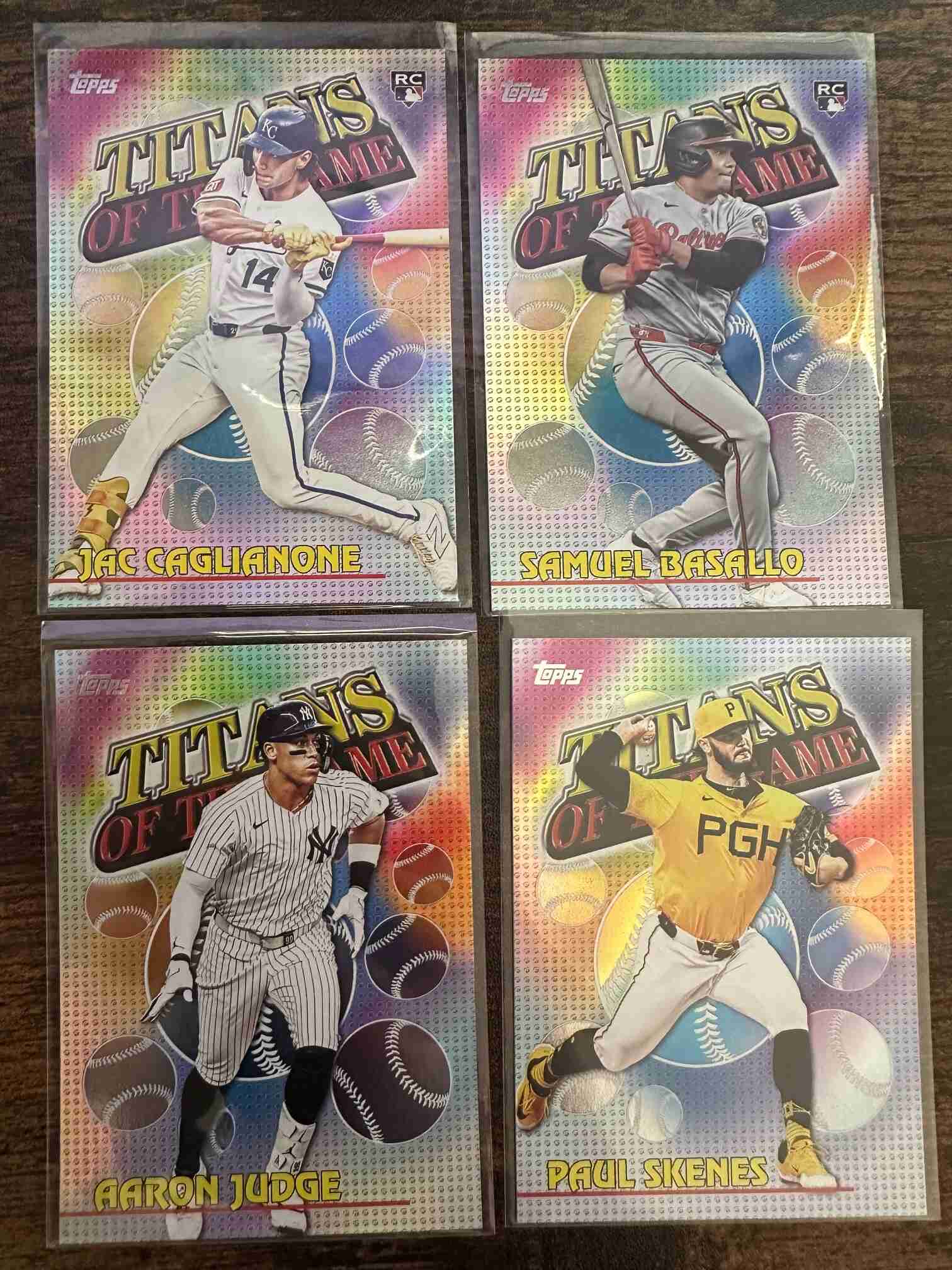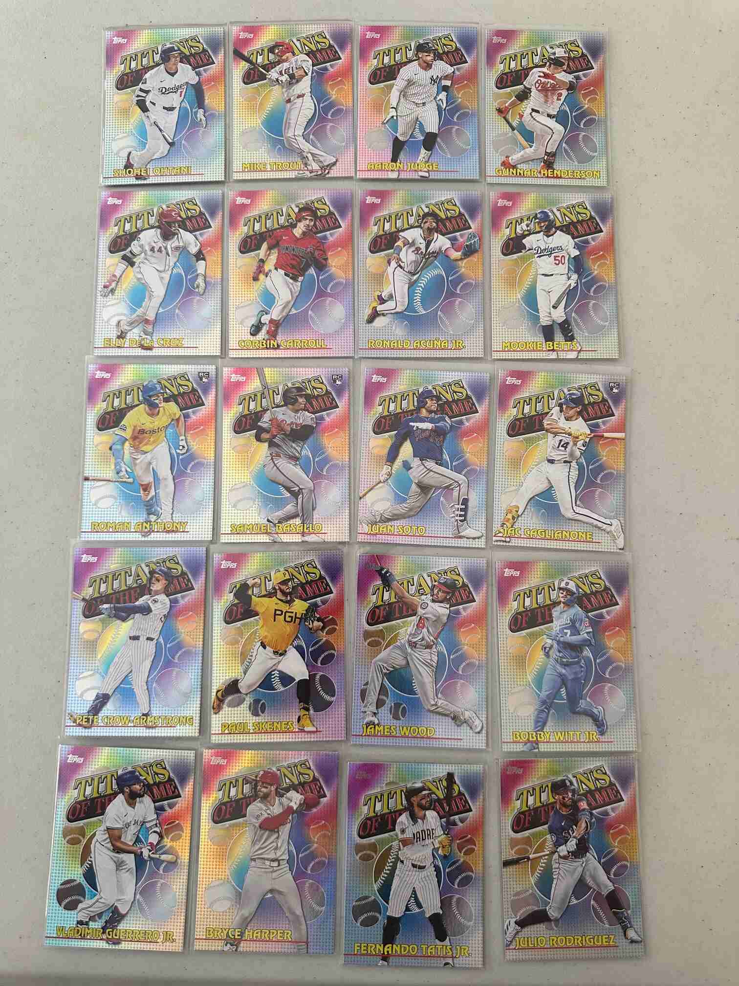 Here we have a new retail exclusive insert from Topps that I really like in addition to the iconic Stars of MLB set; 2026 Topps Series 1 Titans of the Game insert set. This has some great rookies in it, namely Roman Anthony, Samuel Basallo and Jac Caglianone. Plenty of good vets in this slimmed down 20 card insert set as well. Ohtani and Judge are in here. I have other auctions running now from 2025 and 2026 Topps Baseball sets. If you want to pick these up to complete your master sets, or just like how they look, check my other listings, please! Last pic shows the whole set.