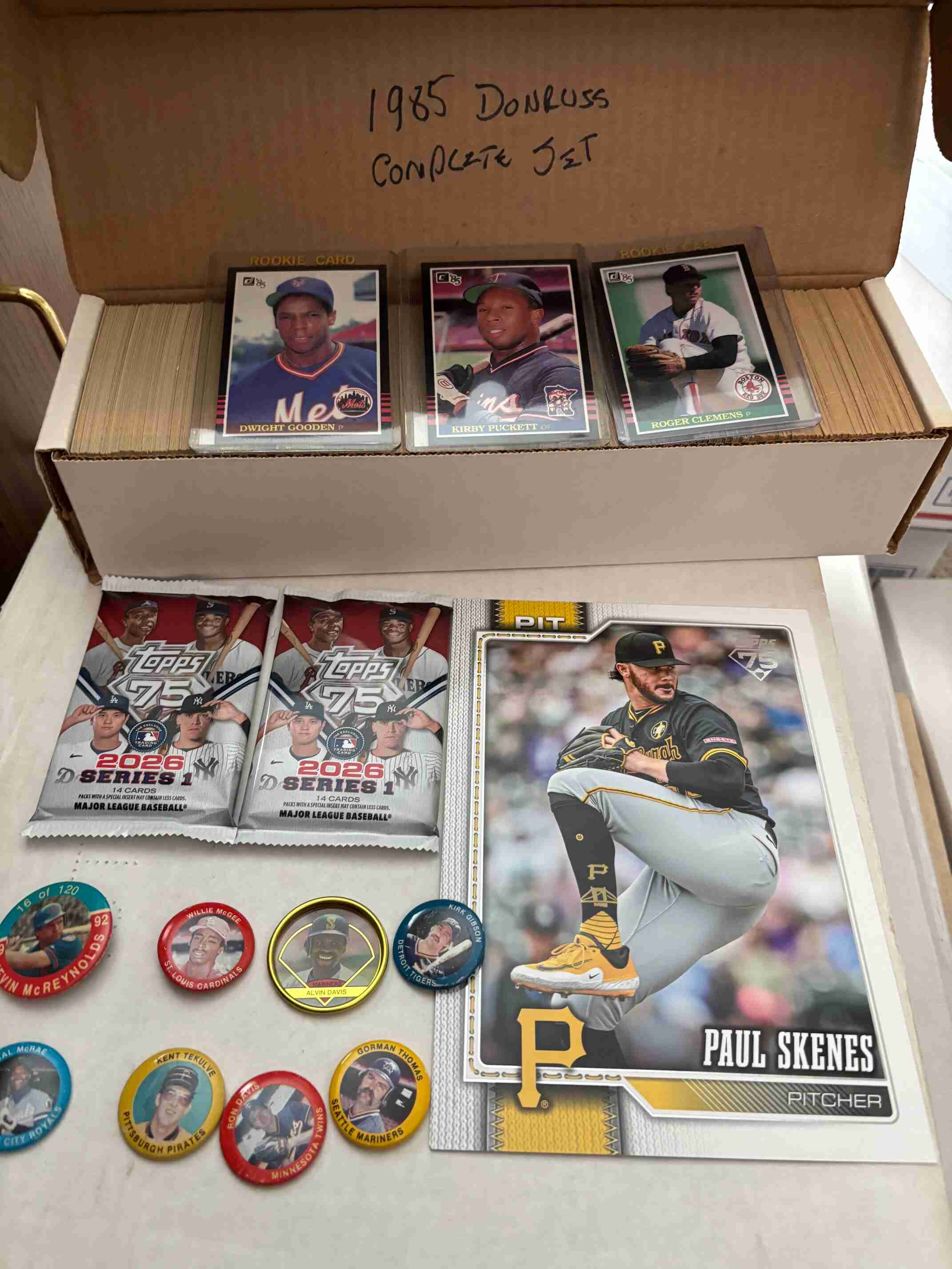 Huge clearance collection of 2500 Baseball cards featuring a very high value 1985 Donruss complete set, and loaded with high value vintage, rookies, stars, rare jumbo Paul Skenes insert, and unopened packs, all in great condition. You will receive everything shown in the photos and more. I am having a complete clearance of my 2,000,000 card collection so please check out my other auctions for more great deals.