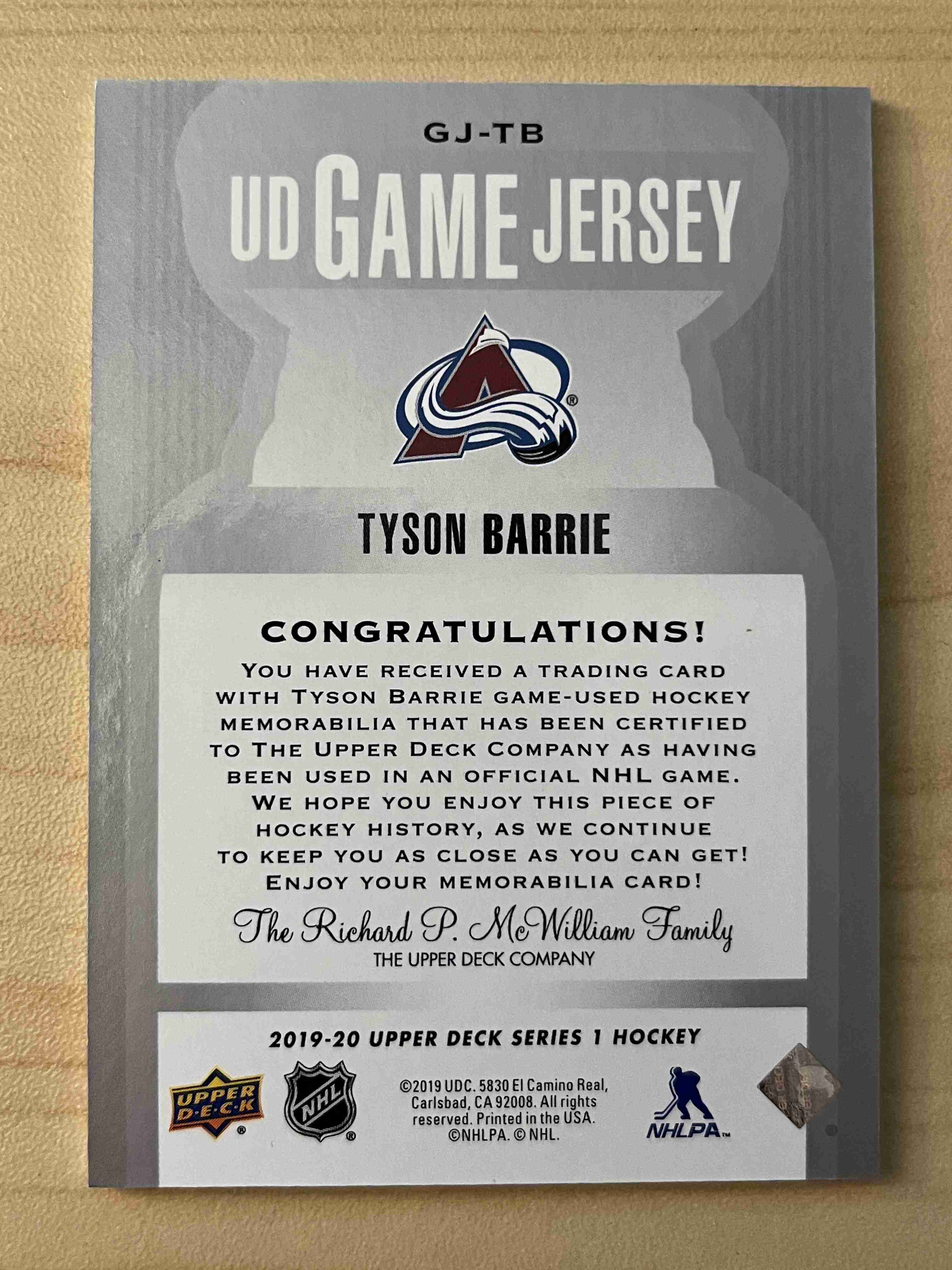 Tyson Barrie 2019-20 Upper Deck Game Jersey #GJ-TB