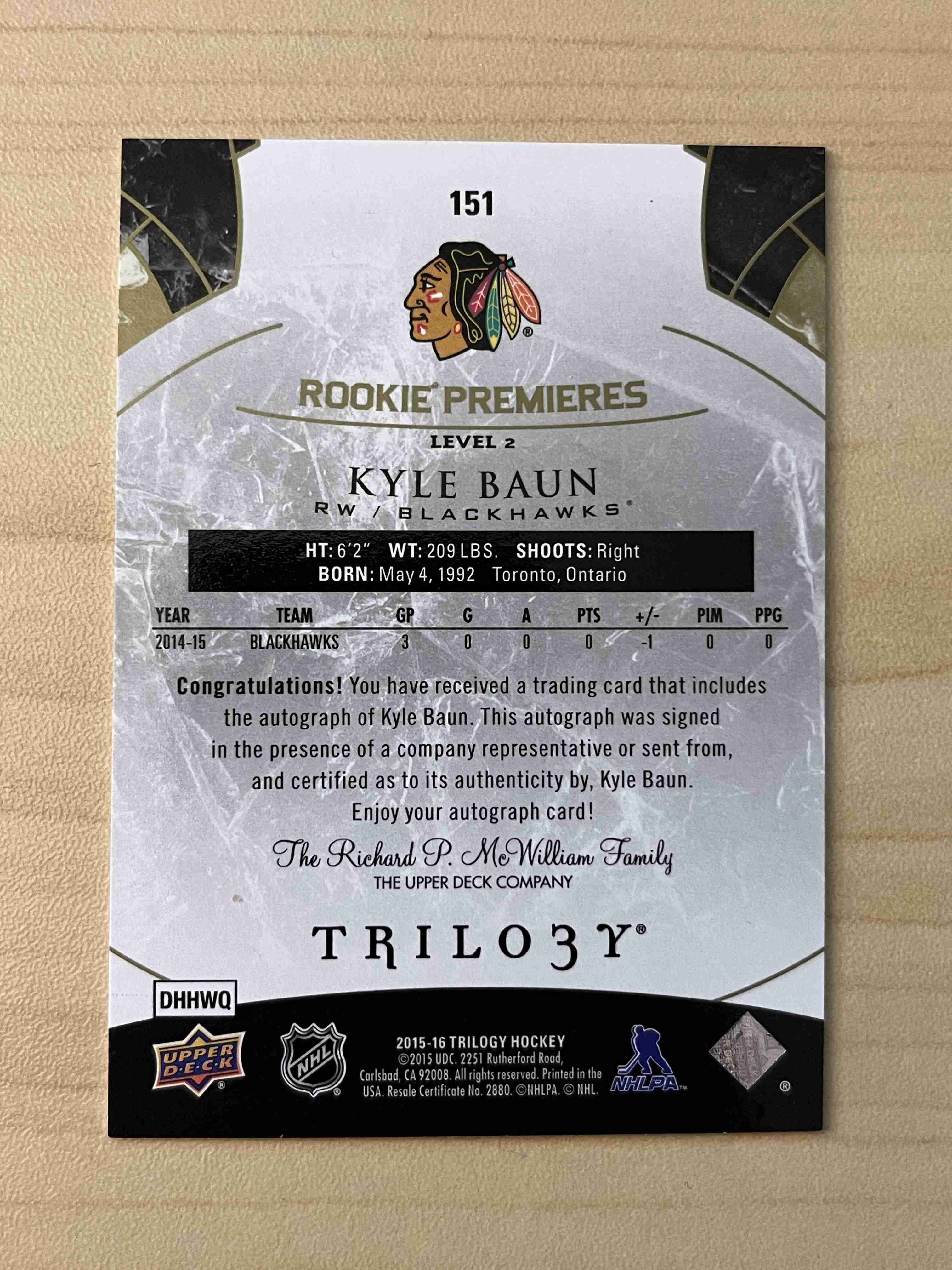 Kyle Baun 2015-16 Trilogy Rookies Premieres Autograph #/499