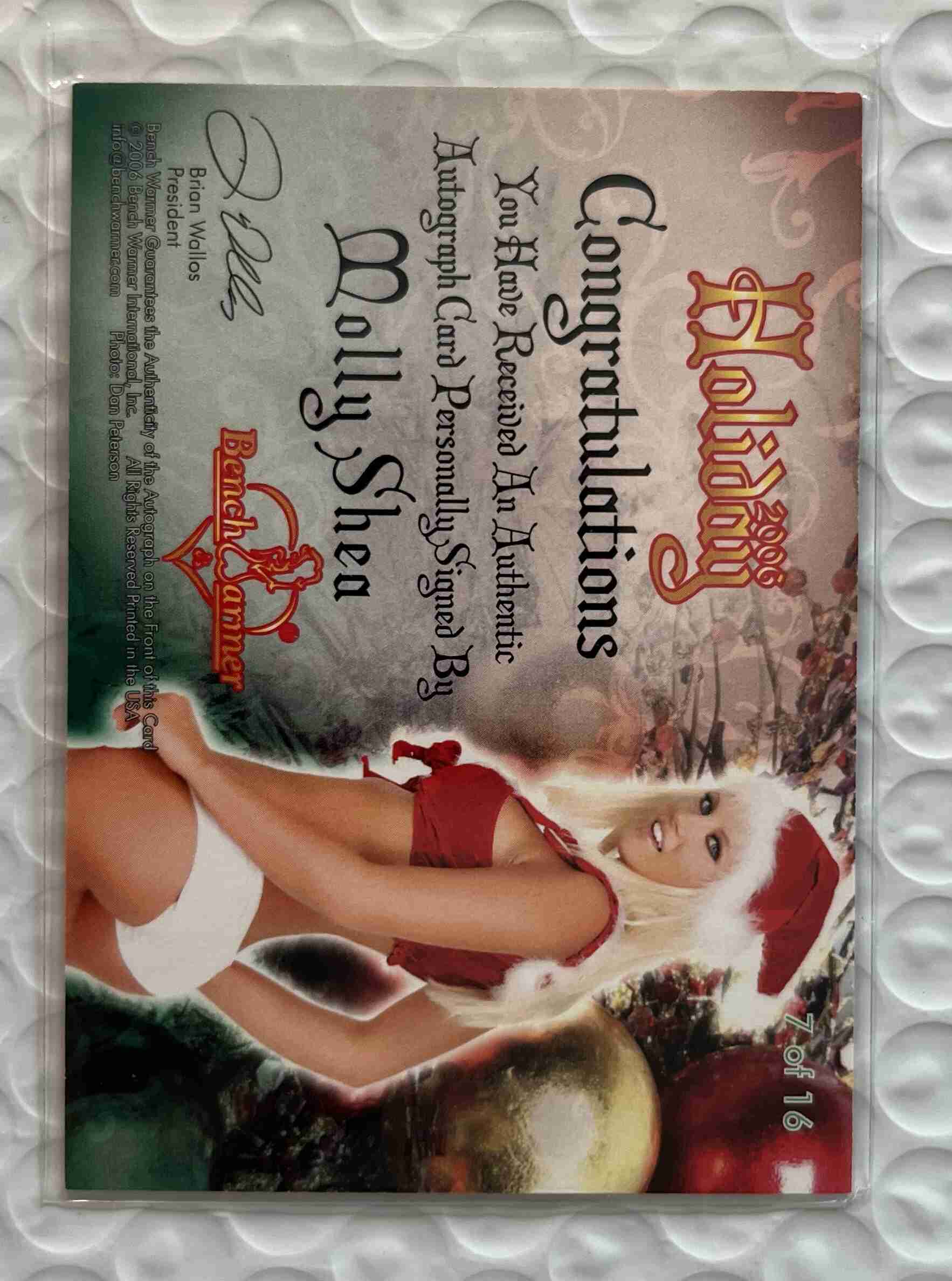 This auction is of a 2006 Benchwarmer Molly Shea Autograph card. Card is in Nrmt condition. Look at the pics and judge for yourself. If any questions please feel free to contact me. Thank you for looking at my auctions.