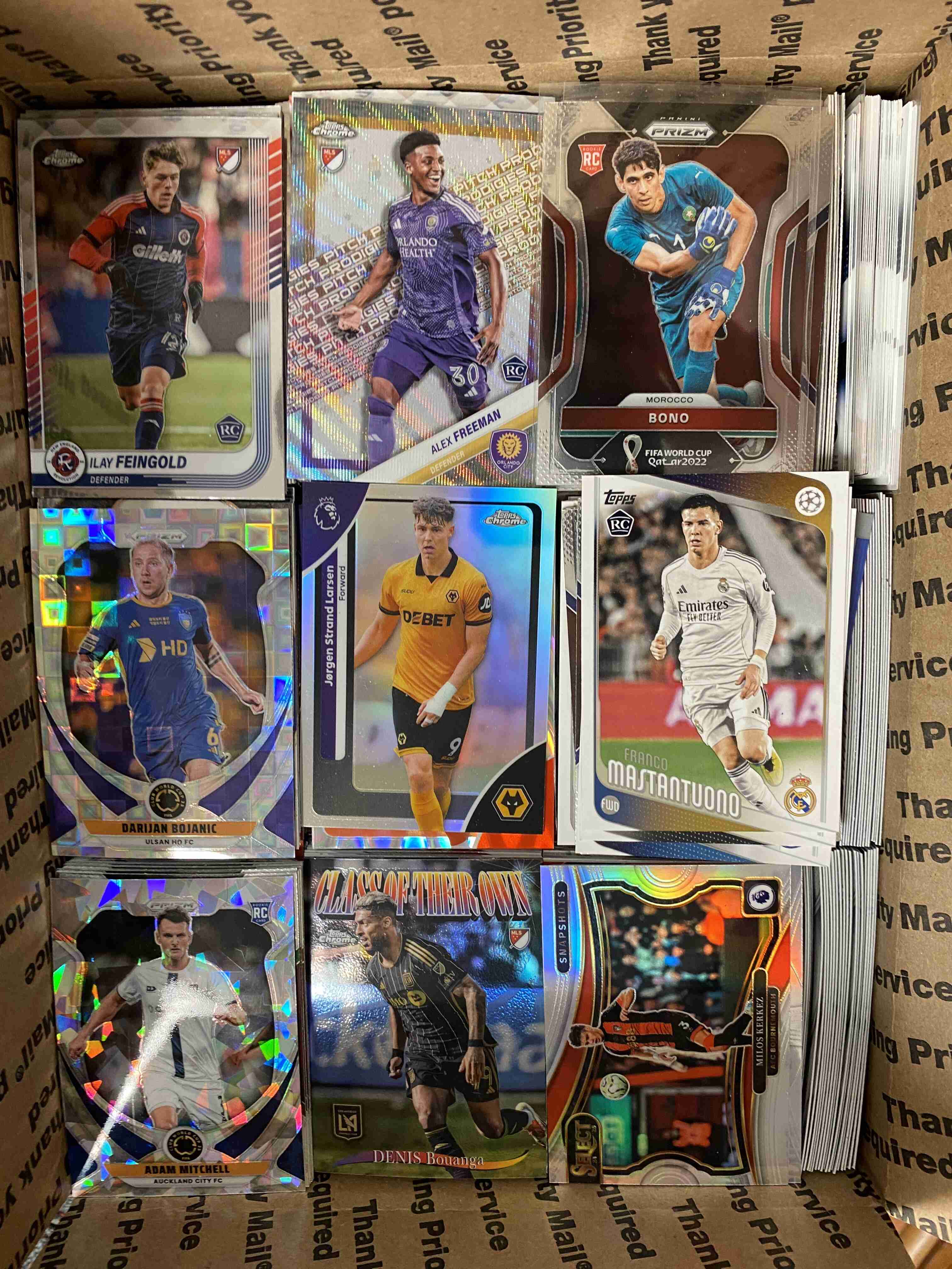 Medium flat rate box filled with soccer base, parallels, rookies, and inserts. I have extremely limited soccer knowledge, these were accumulated from lot purchases. Cards will come double boxed for protection, should be in NM or better condition.