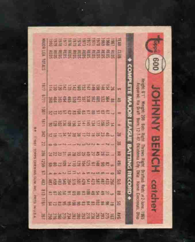 1981 Topps # 600 JOHNNY BENCH Reds NM