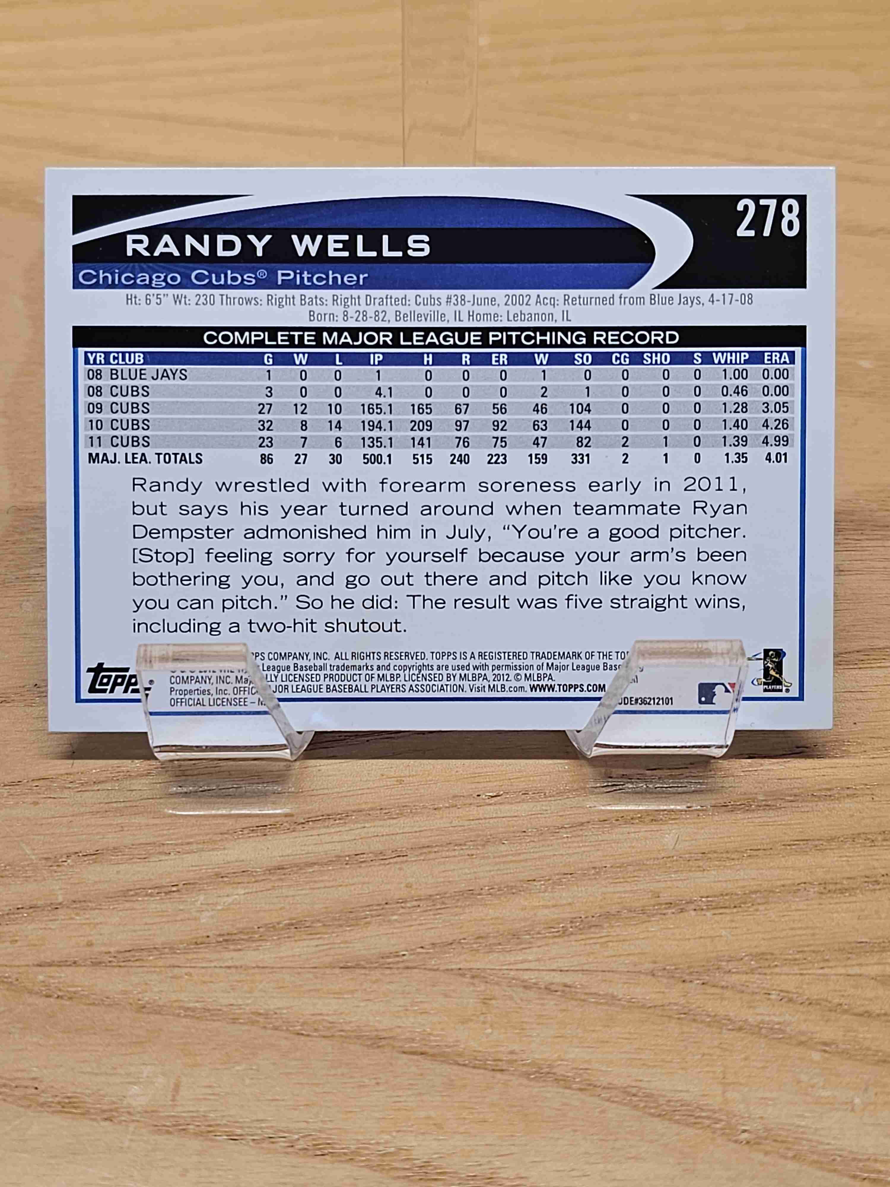 2012 Topps Baseball Randy Wells Chicago Cubs Card #278