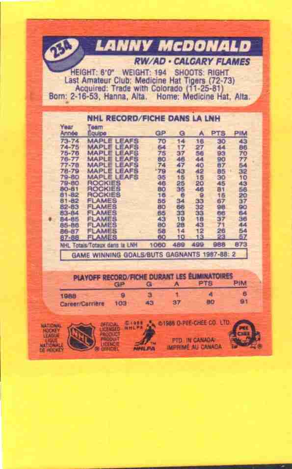 Lanny McDonald #234 1988 O-Pee-Chee