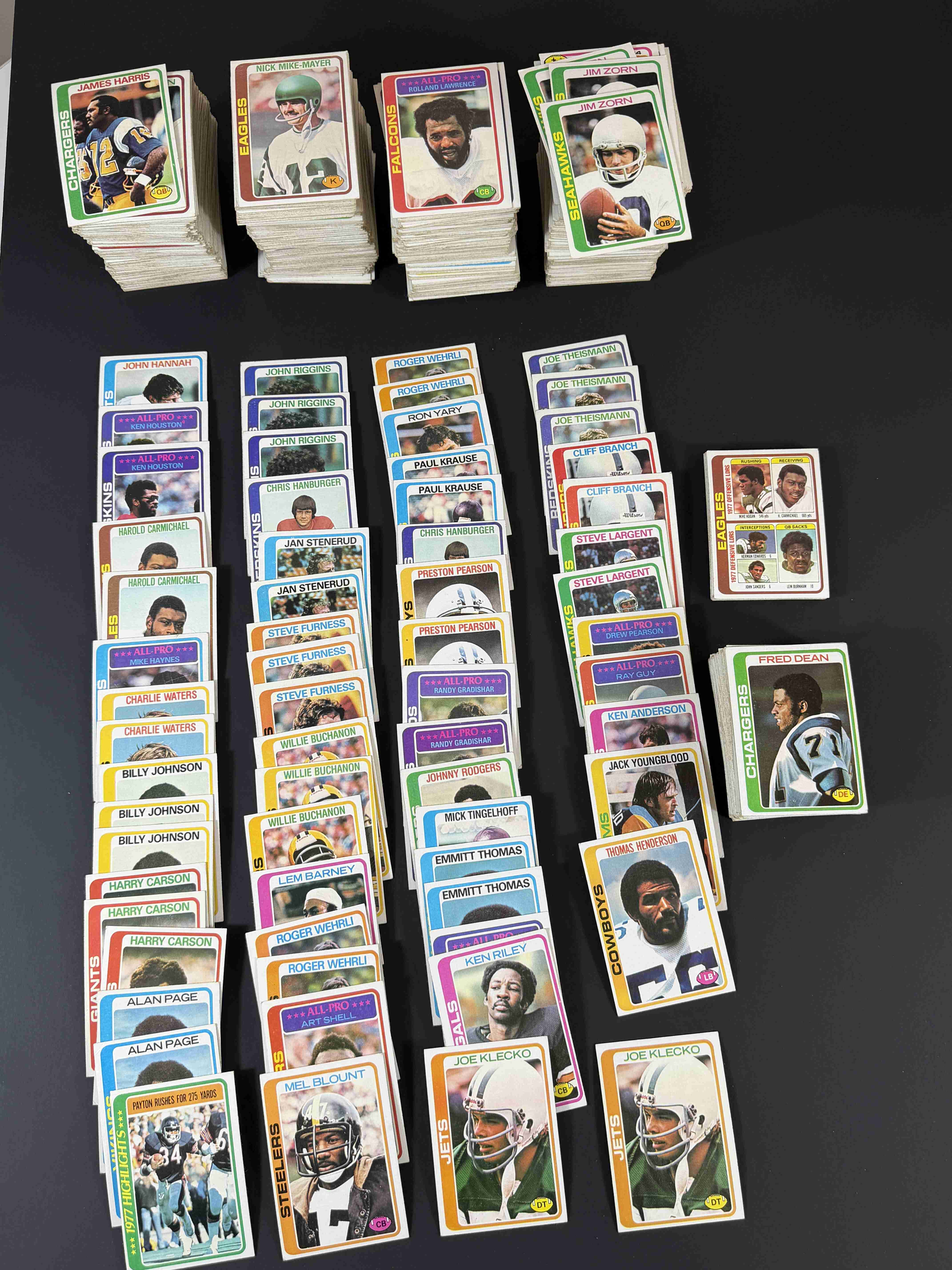 1000 assorted 1978 Topps football cards with tons of stars and rookie cards of HOFers Fred Dean & 2 Joe Klecko. Condition ranges from VG to VG-EX with a few less. Tons and tons of star power here.