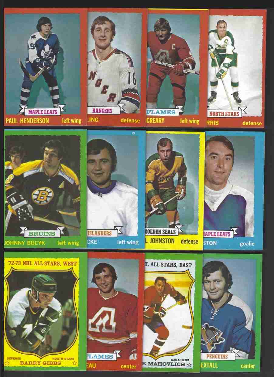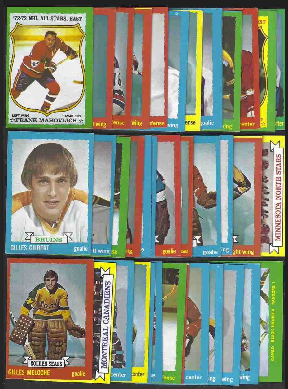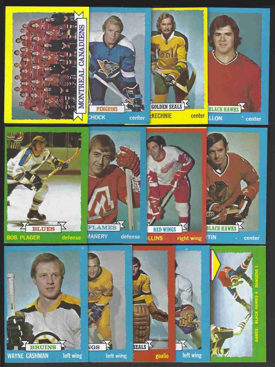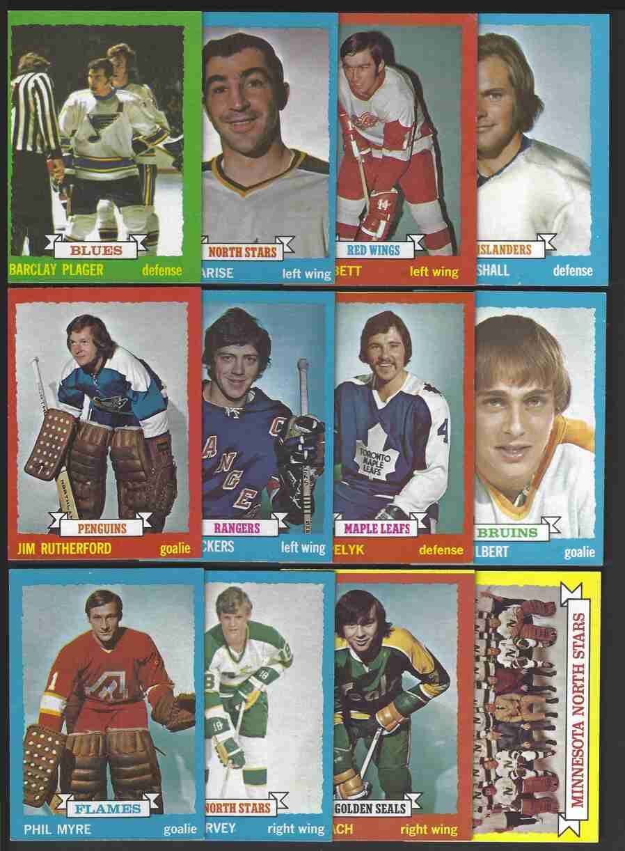 1973-74 Topps Hockey Lot (37) -Higher Grade-. No's-7,9,13,14,18,21,23,26,29, 30,40,43,46,47,49,51,57,59,71,74,77,78,84,99,100,113,127,129,131,134,158,164, 166,172,175,178,196. Excellent lot of 1973-74 Topps Hockey cards. This is a higher-grade lot. Cards have minor flaws - bright color, nice corners. Nice lot for this condition-sensitive set. Please review scans carefully for condition.