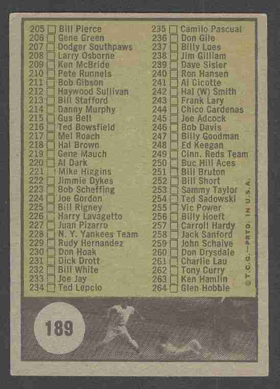 1961 TOPPS 3RD SERIES CHECKLIST #189 VARIATION - HIGH GRADE