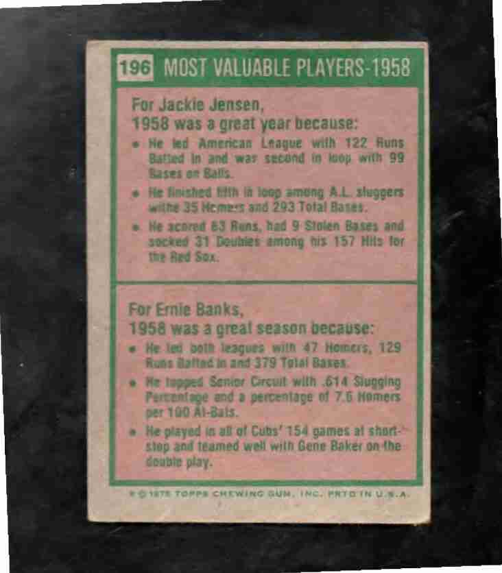 1975 Topps #196 1958 MVPs Jensen & Ernie Banks
