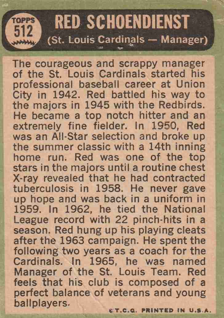 1967 Topps #512 Red Schoendienst Mgr. Cardinals