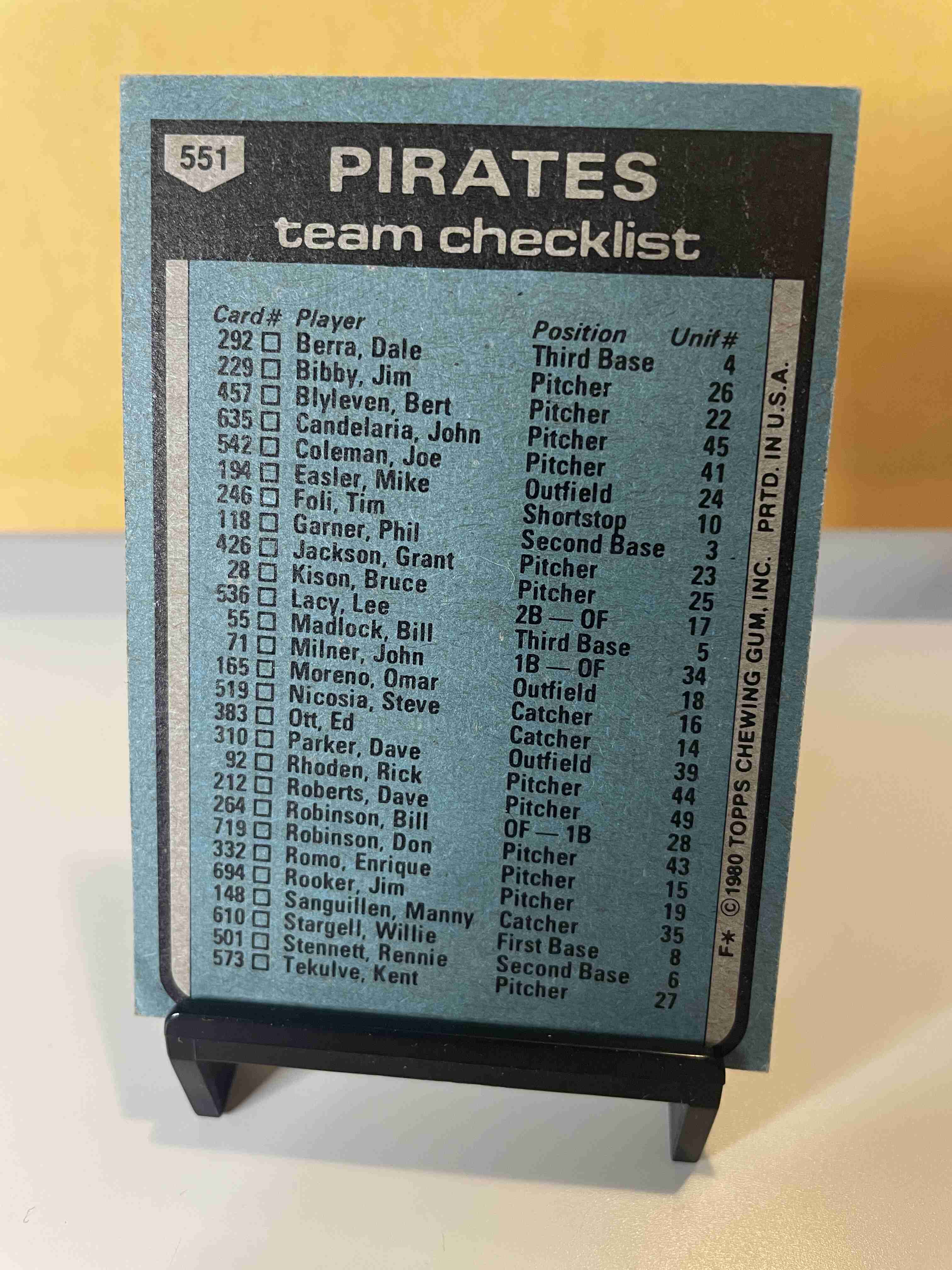 1980 Topps #551 Pirates Team Checklist Unmarked .. Lower left corner does have a ding.