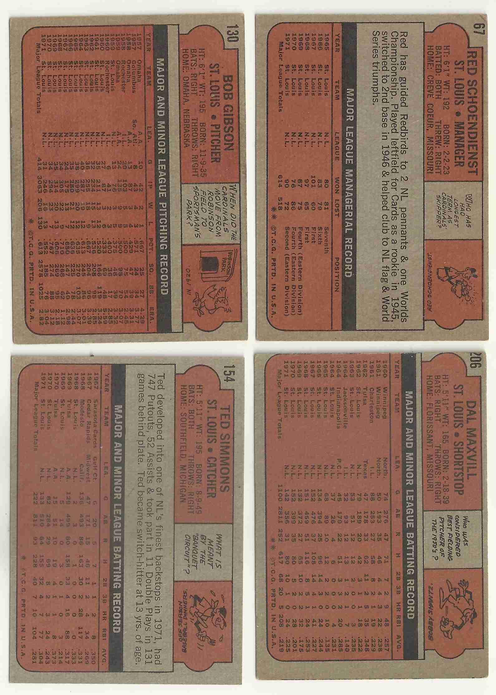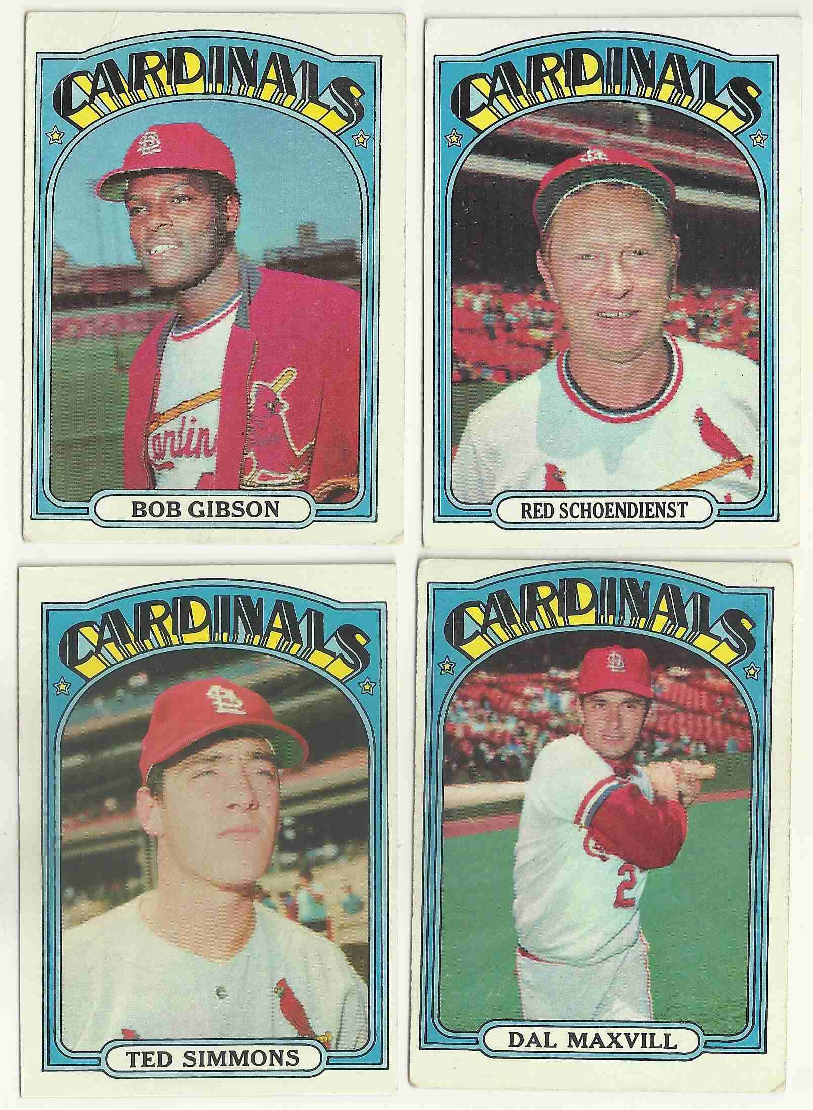 Lot of (4) 1972 Topps Cardinals Bob Gibson Ted Simmons Red Schoendienst Dal Maxvill. See scans for condition.