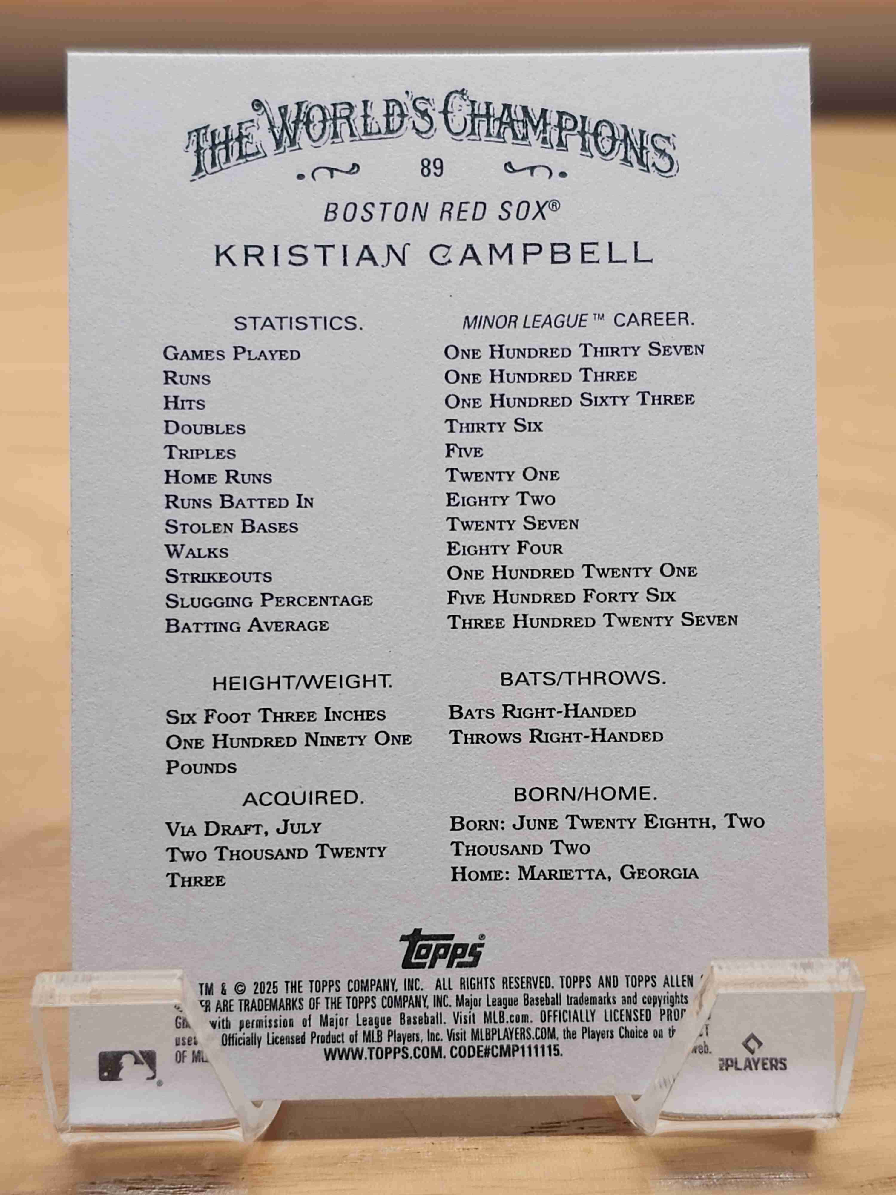 2025 Topps Allen & Ginter Baseball Rookie RC Kristian Campbell Boston Red Sox Card #89