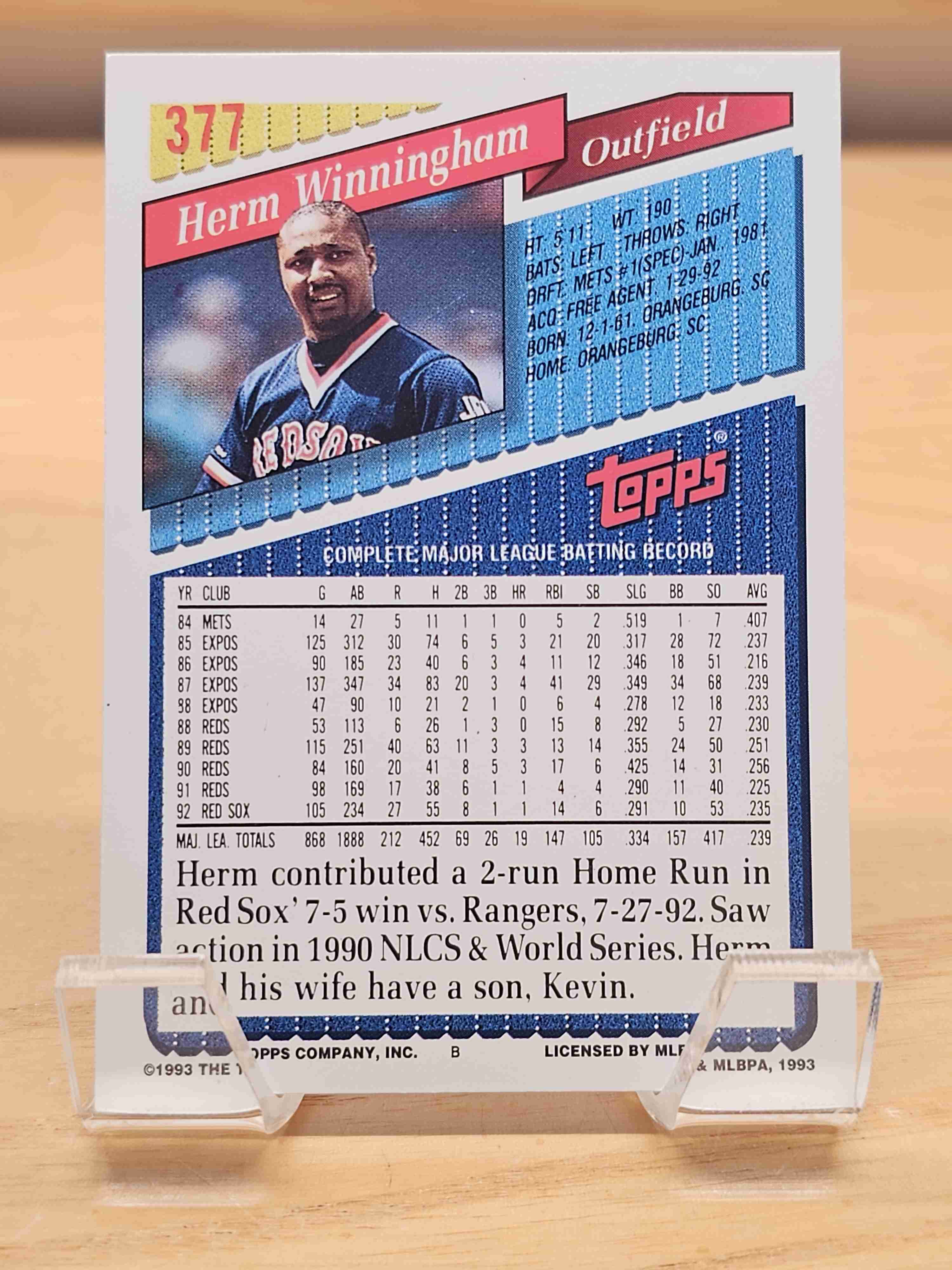 1993 Topps Baseball Topps Gold Herm Winningham Boston Red Sox Card #377