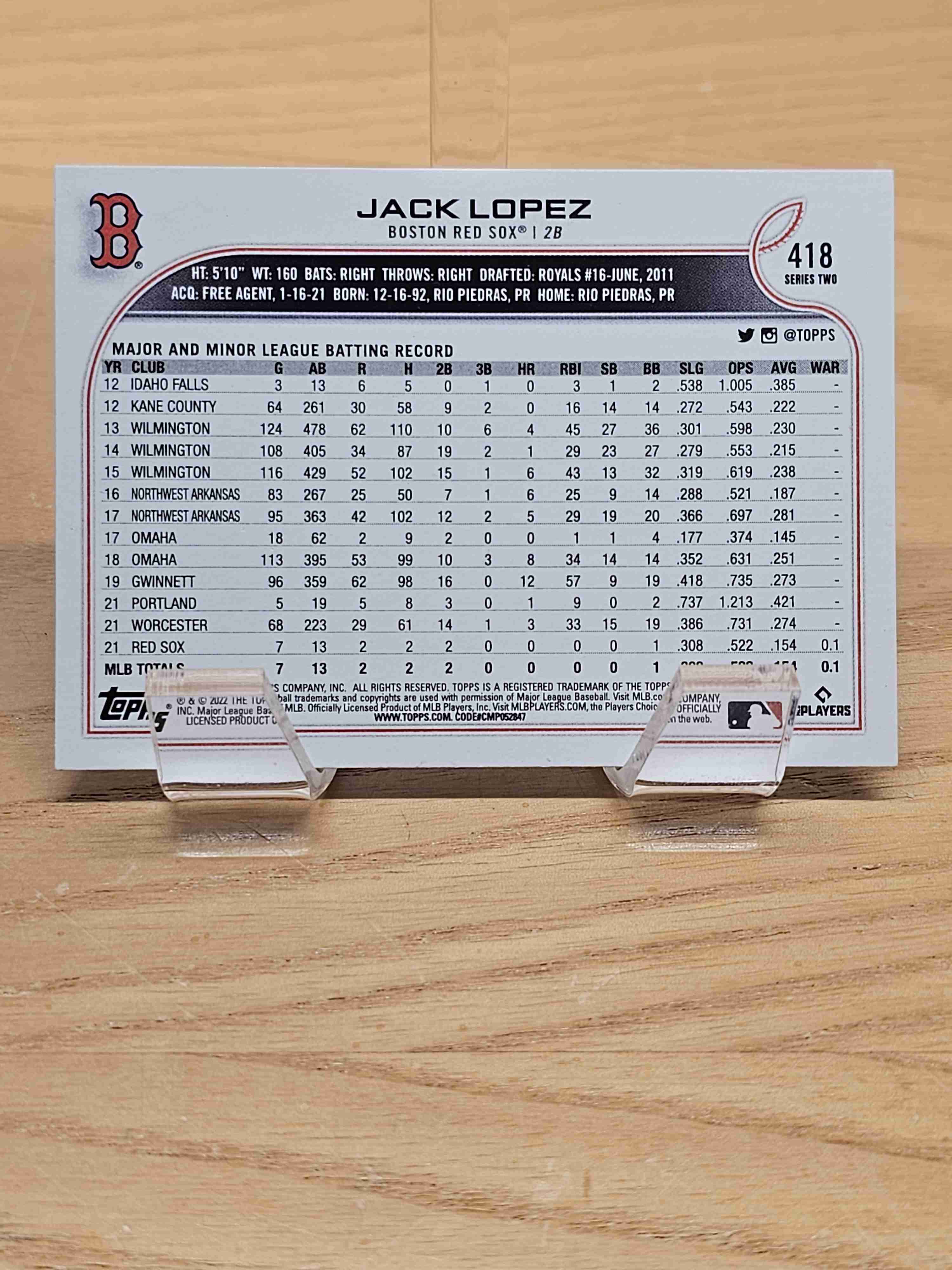 2022 Topps Series Two Baseball Rookie RC Jack Lopez Boston Red Sox Card #418
