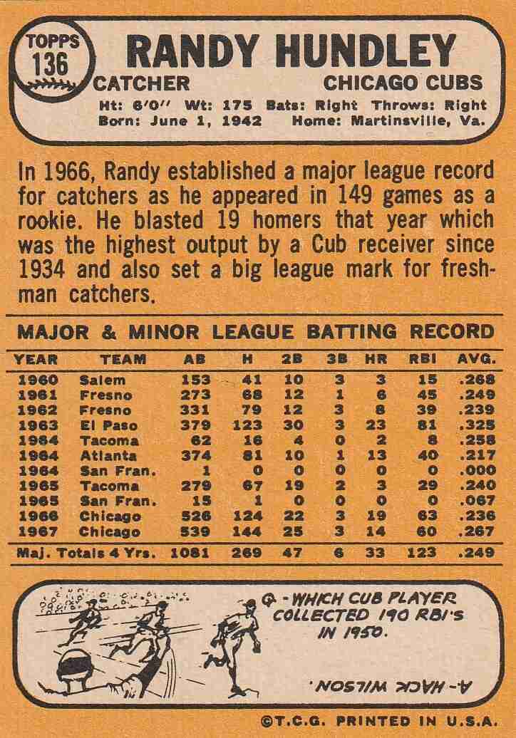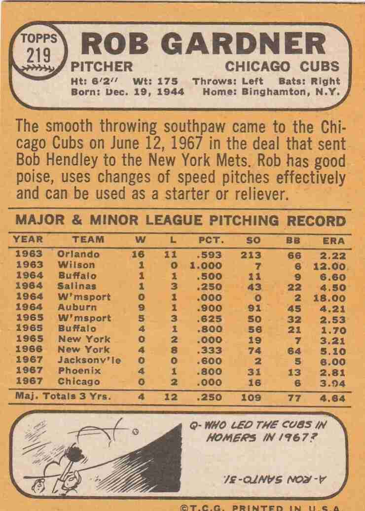 2-1968 Topps Chicago Cubs #'s 136 219