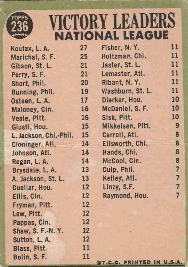 1967 Topps #236 '66 NL Pitching Leaders (lower grade)