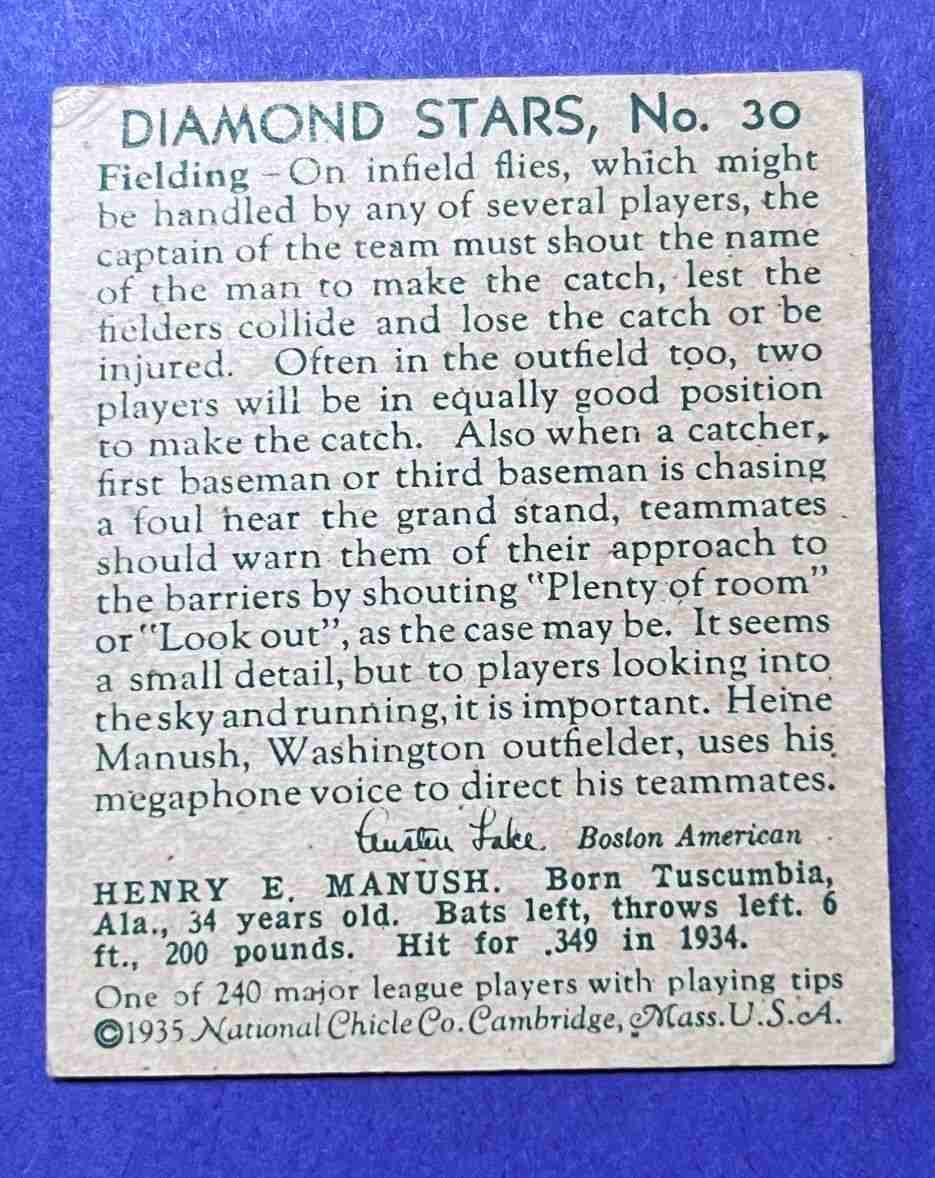 1934-36 DiamondStars HEINIE MANUSH #30 HOF!