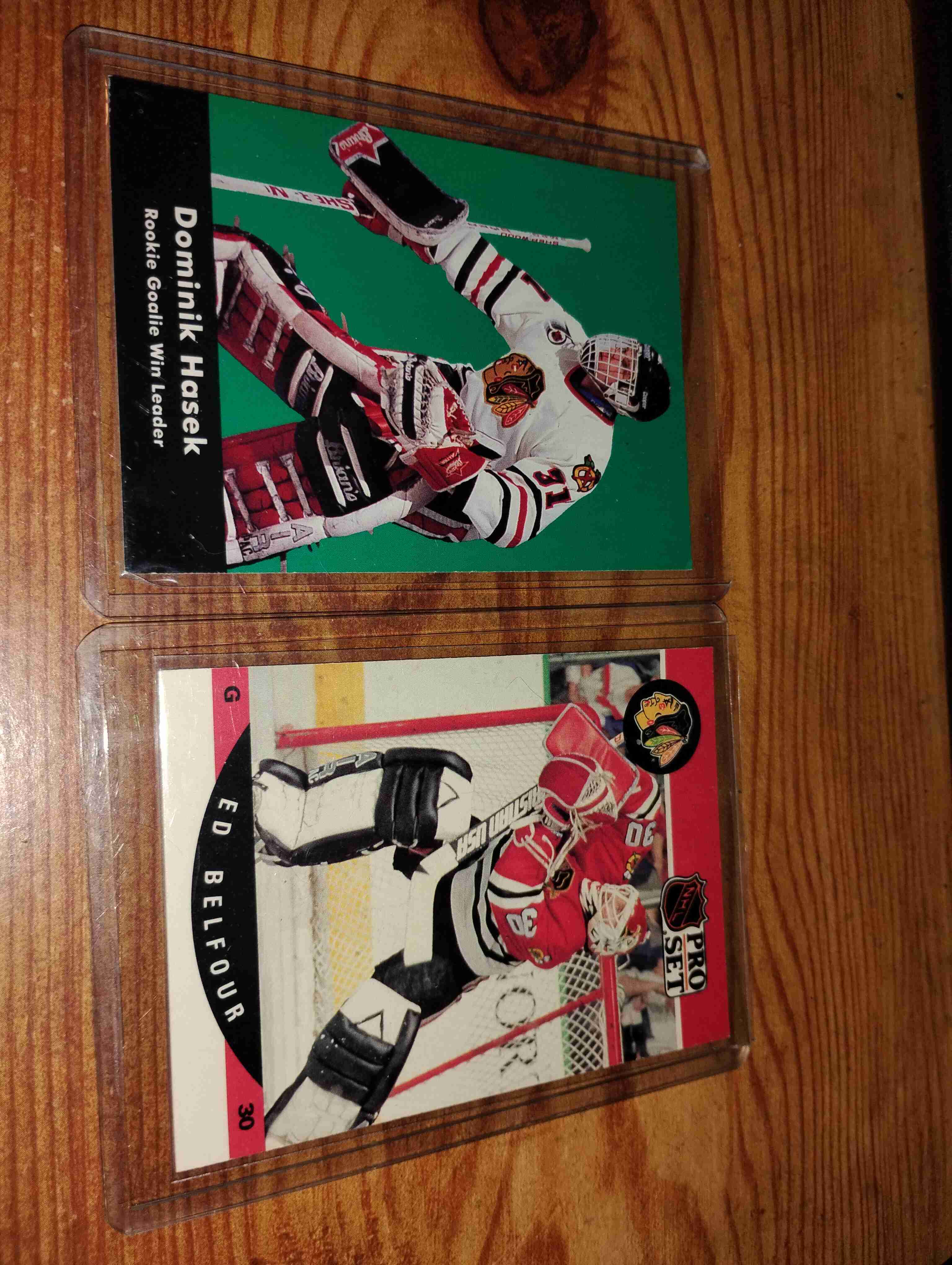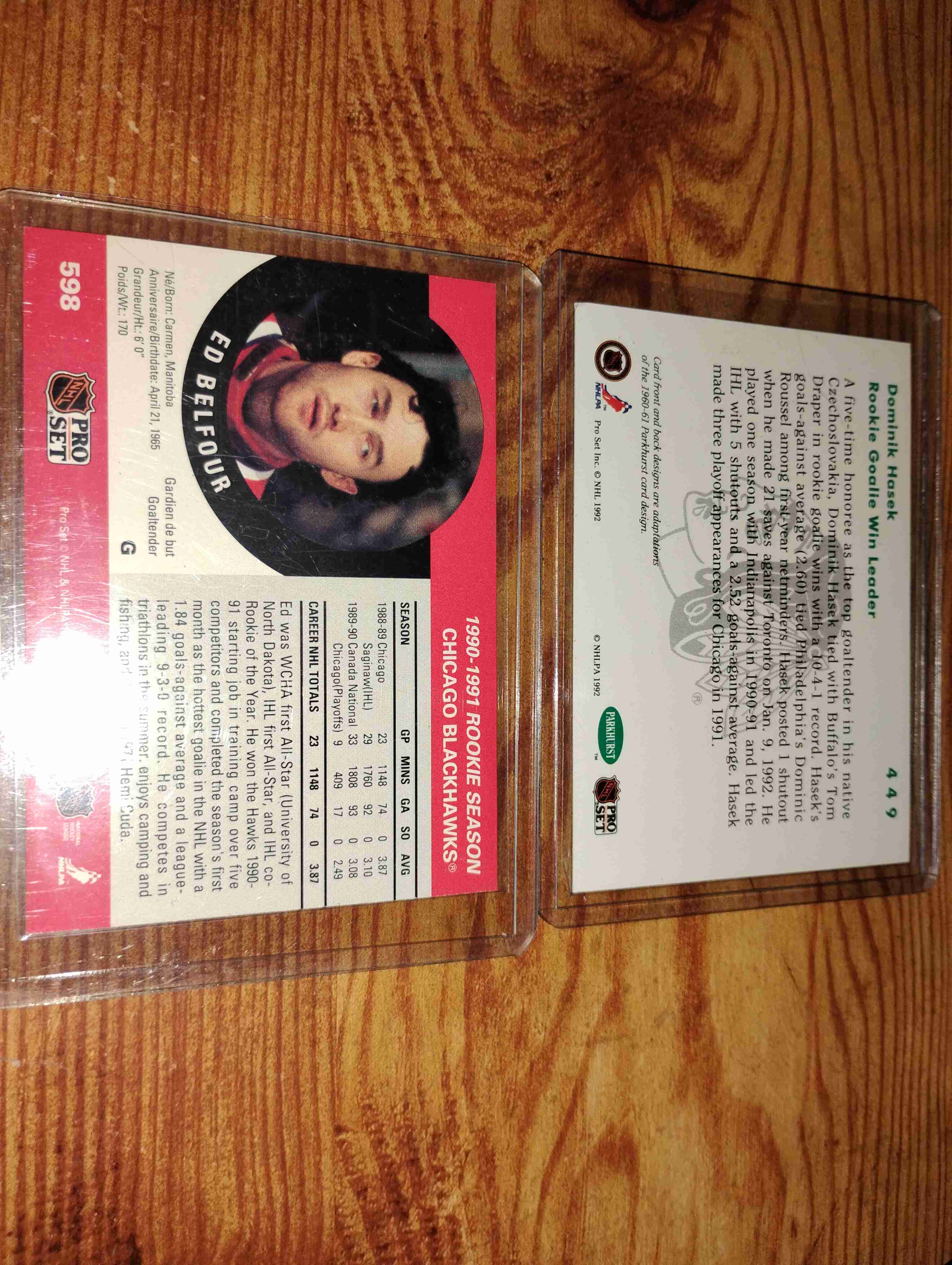 CARDS ARE PICTURED IN HARD PLASTIC SLEEVES IN EXCELLENT CONDITION.1990 PRO SET ED BELFOUR CARD #598 AND DOMINIK HASEK 1992 PARKHURST CARD #449.2 MYSTERY HOCKEY HALL OF FAMER CARDS WILL BE ADDED TO THE WINNING BID.