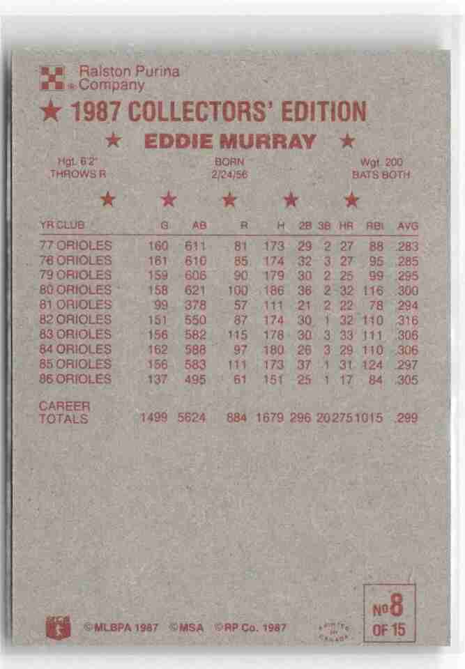 1987 RALSTON PURINA #8 EDDIE MURRAY BALTIMORE ORIOLES