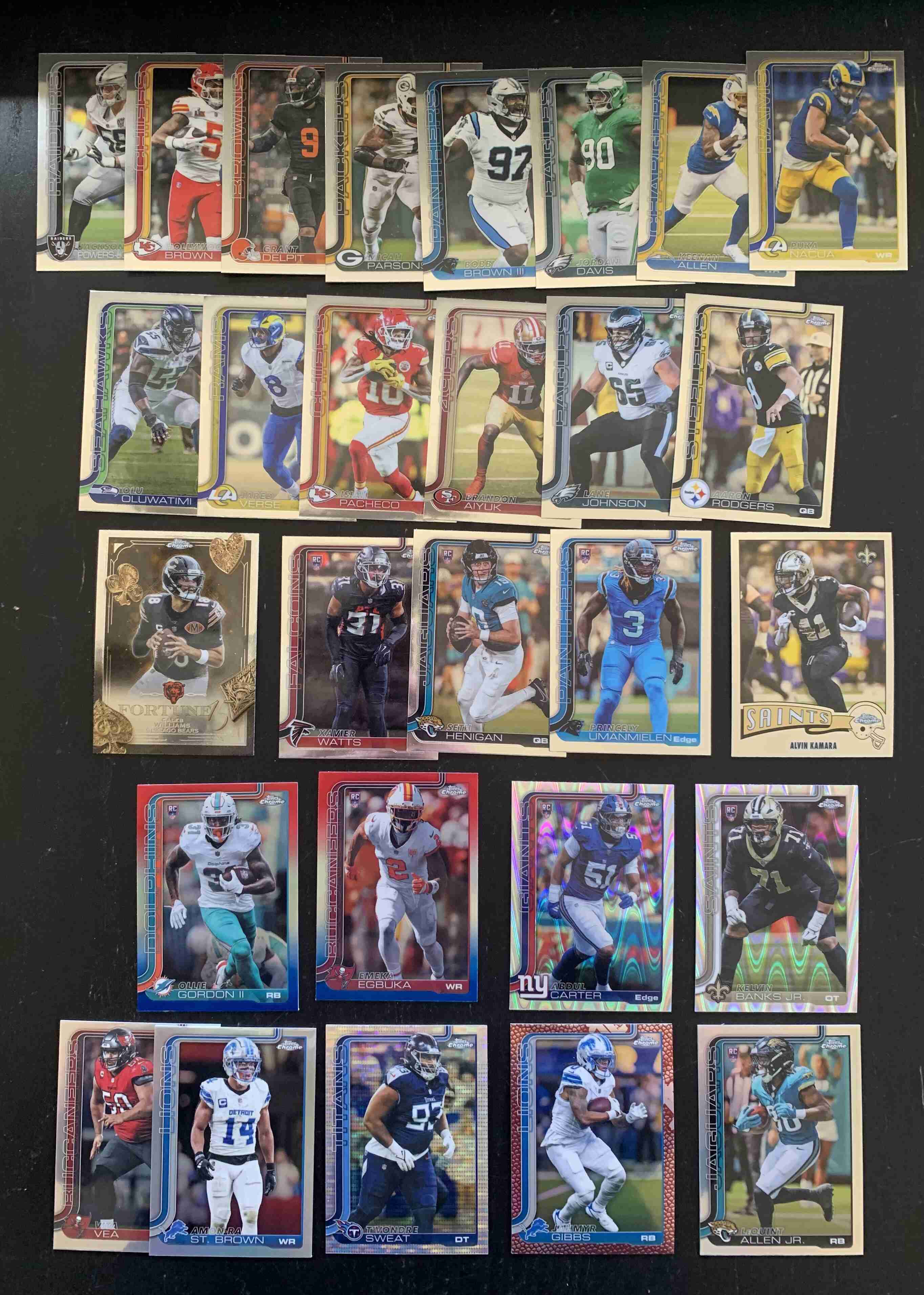 For auction is a lot of 28 Cards from the Brand New 2025 Topps Chrome Football. Lot includes an Assortment of Base, RCs, Inserts, and Refractors. Lot includes all cards pictured. Overall, cards are NM or better, though there are a couple with surface scratches. Please refer to photo for more details. Lot ships securely with tracking via USPS.
