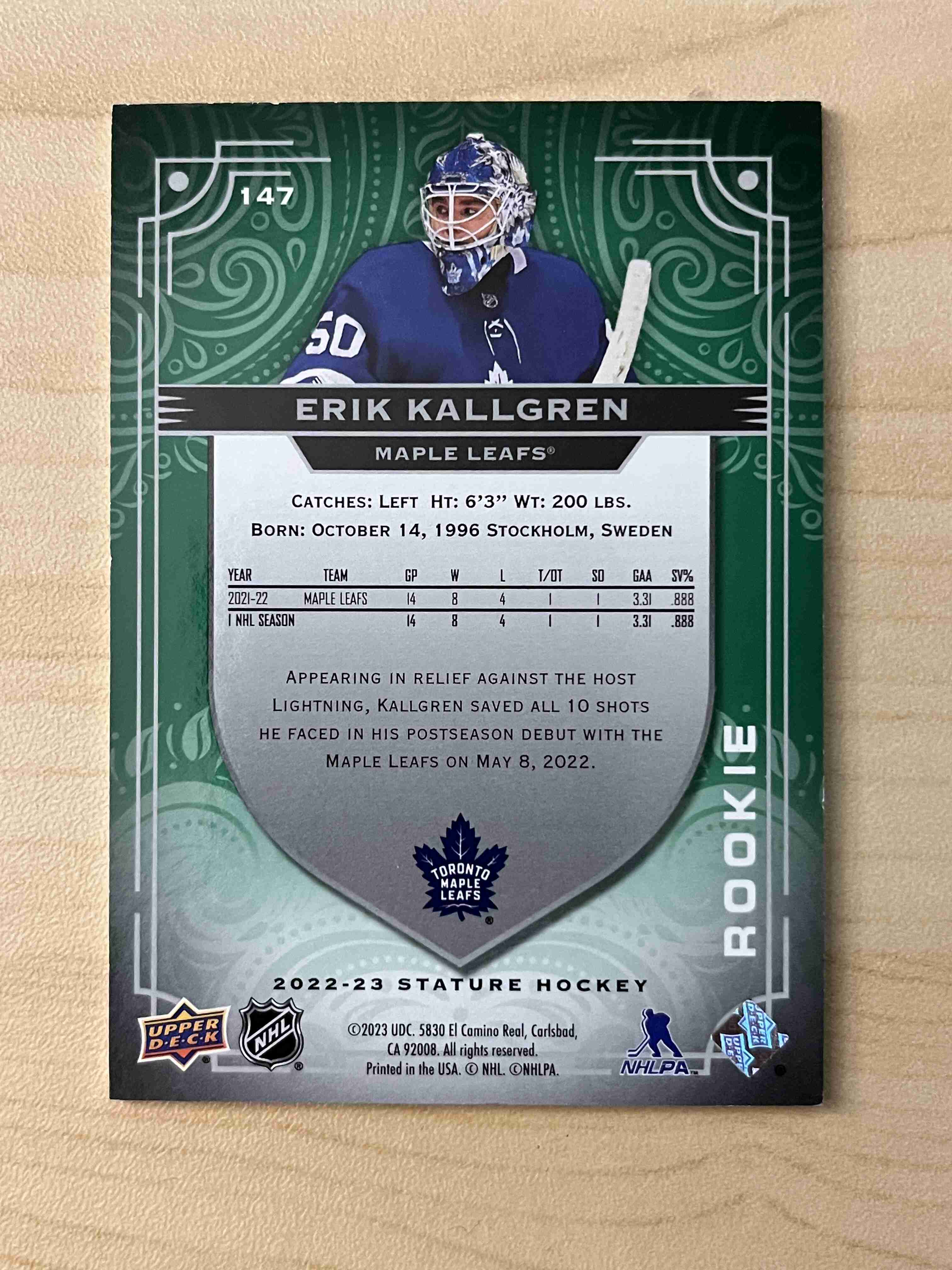 Erik Kallgren 2022-23 UD Stature Rookie Green (#99/99)