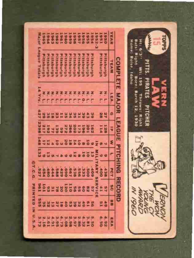 1966 Topps # 15 VERN LAW Pittsburgh Pirates