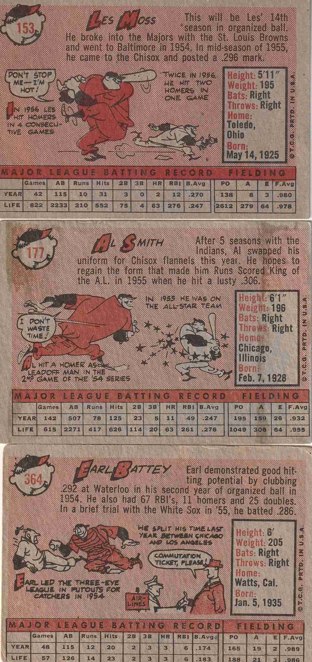 #153 Les Moss (EX+) gum staining//mild blemish #177 Al Smith (VG+/EX) crease damage upper left border #364 Earl Battey (VG+/EX) rounded corners//intact//OC