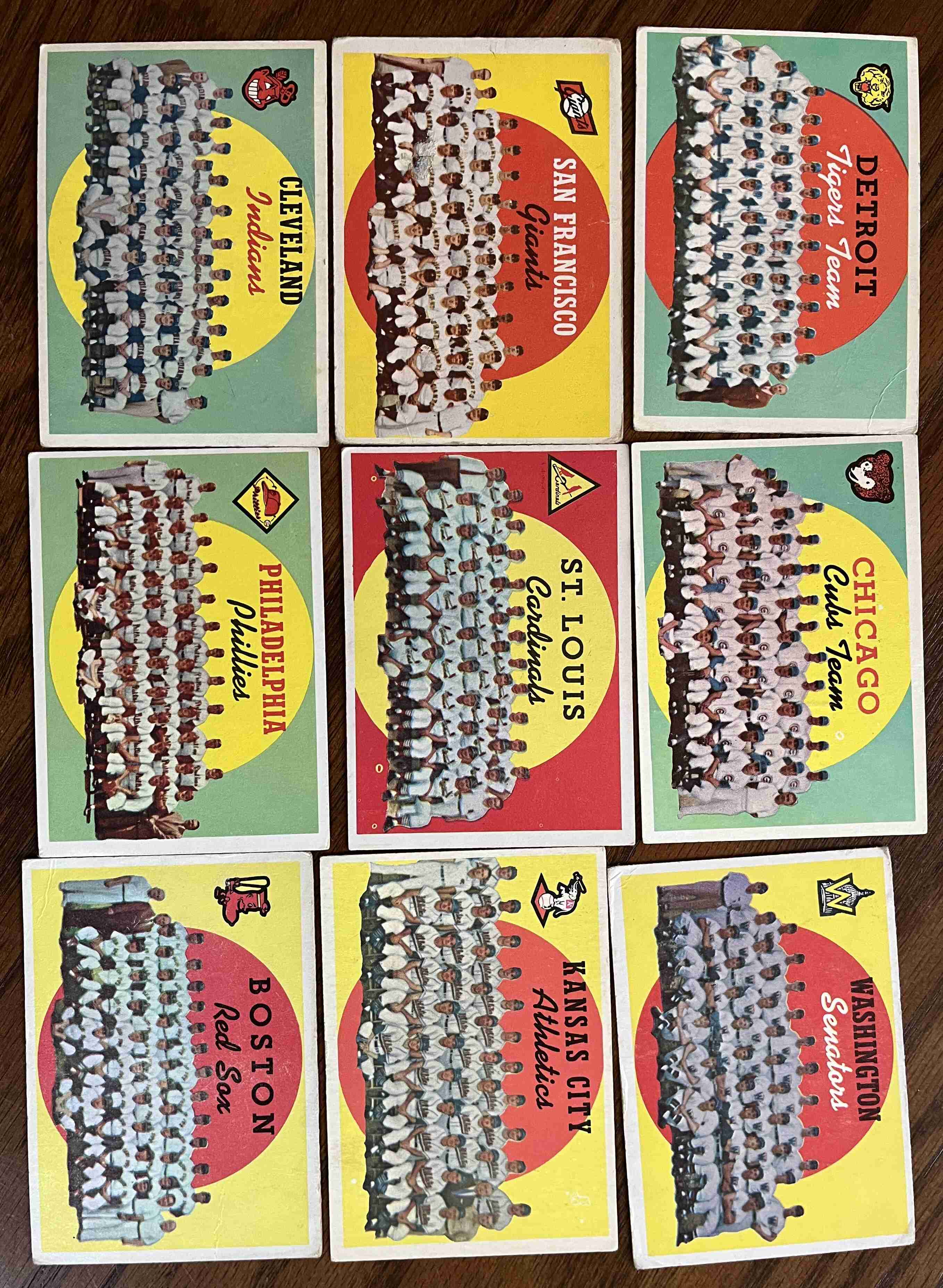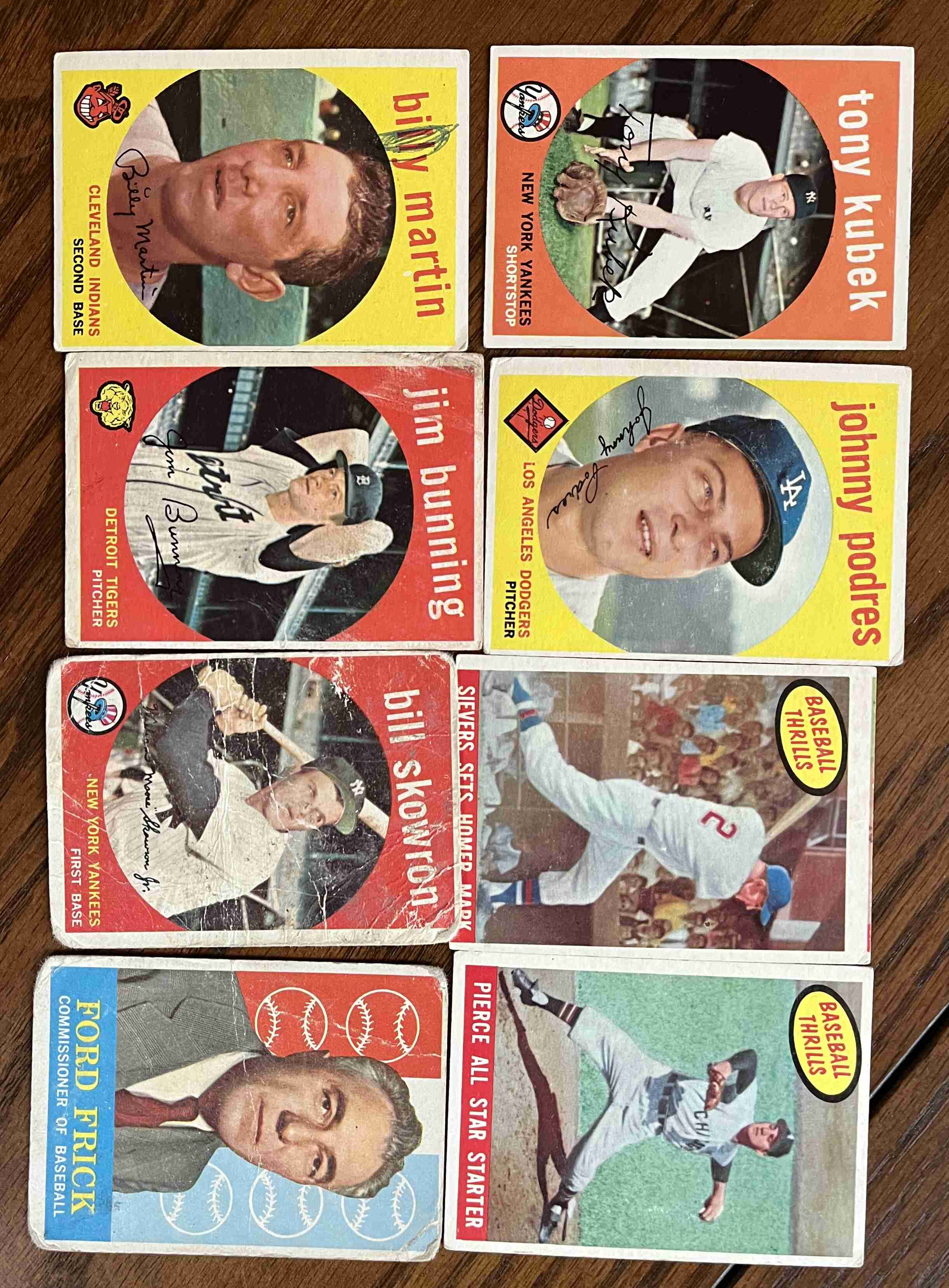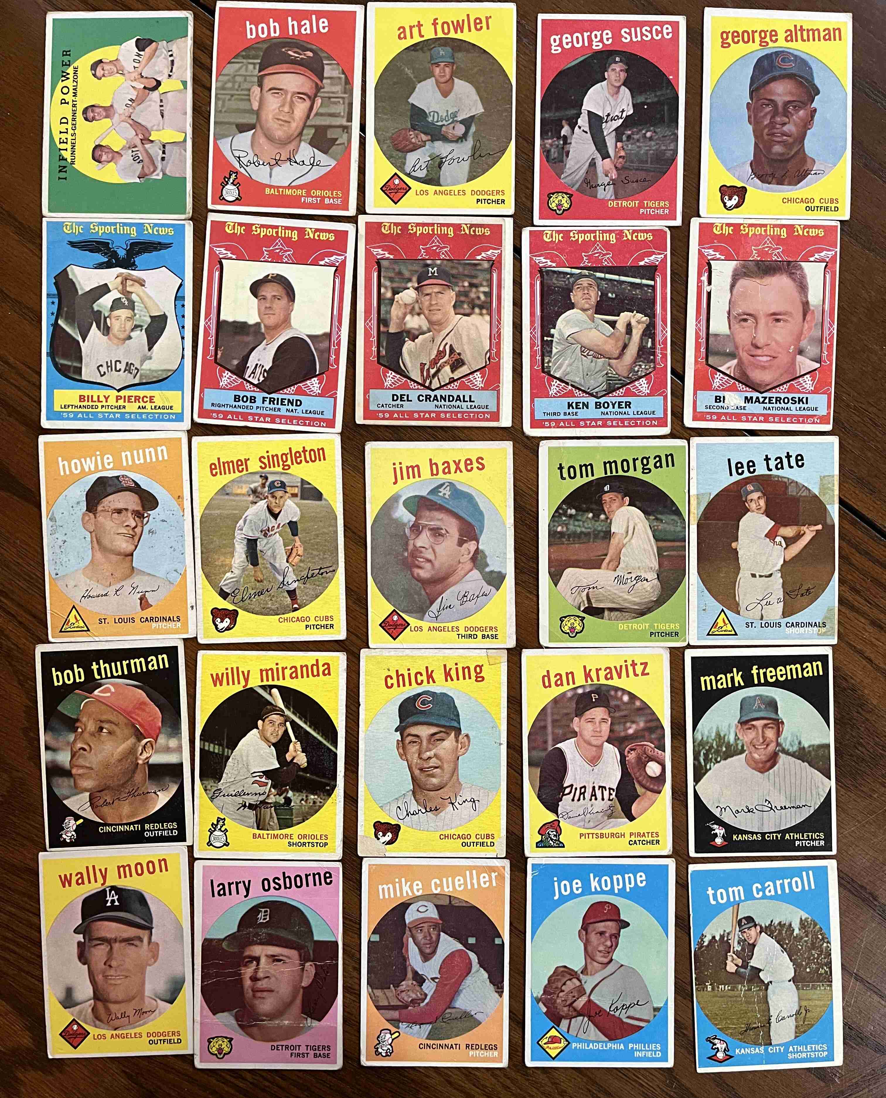 117 different 1959 Topps. 25 High Numbers: #507, 508, 511, 512, 513 (creased), 517 (creased), 518 Mike Cueller RC, 519, 524 (creased), 530 Wally Moon (creased), 532, 536, 538 (tape), 540, 541 (creased), 544 (tape), 545 (creased), 547 (creased), 548, 549, 557 Ken Boyer AS (creased), 555 Bill Mazeroski (filler), 565 , 567, 569, & 572 Billy Pierce AS (creased). 9 Team Checklists: #8, 69, 172, 223, 248, 304, 329, 397, & 478. All are check except #248. Other key cards: #1 Ford Frick (creased), 90 Bill Skowron (filler), 149 Jim Bunning, 295 Billy Martin (writing on front), 465, 466, 495 Johnny Podres, & 505 Tony Kubek. Condition of the cards is good to VG, with some worse & a few better. Total high book is $1965.
