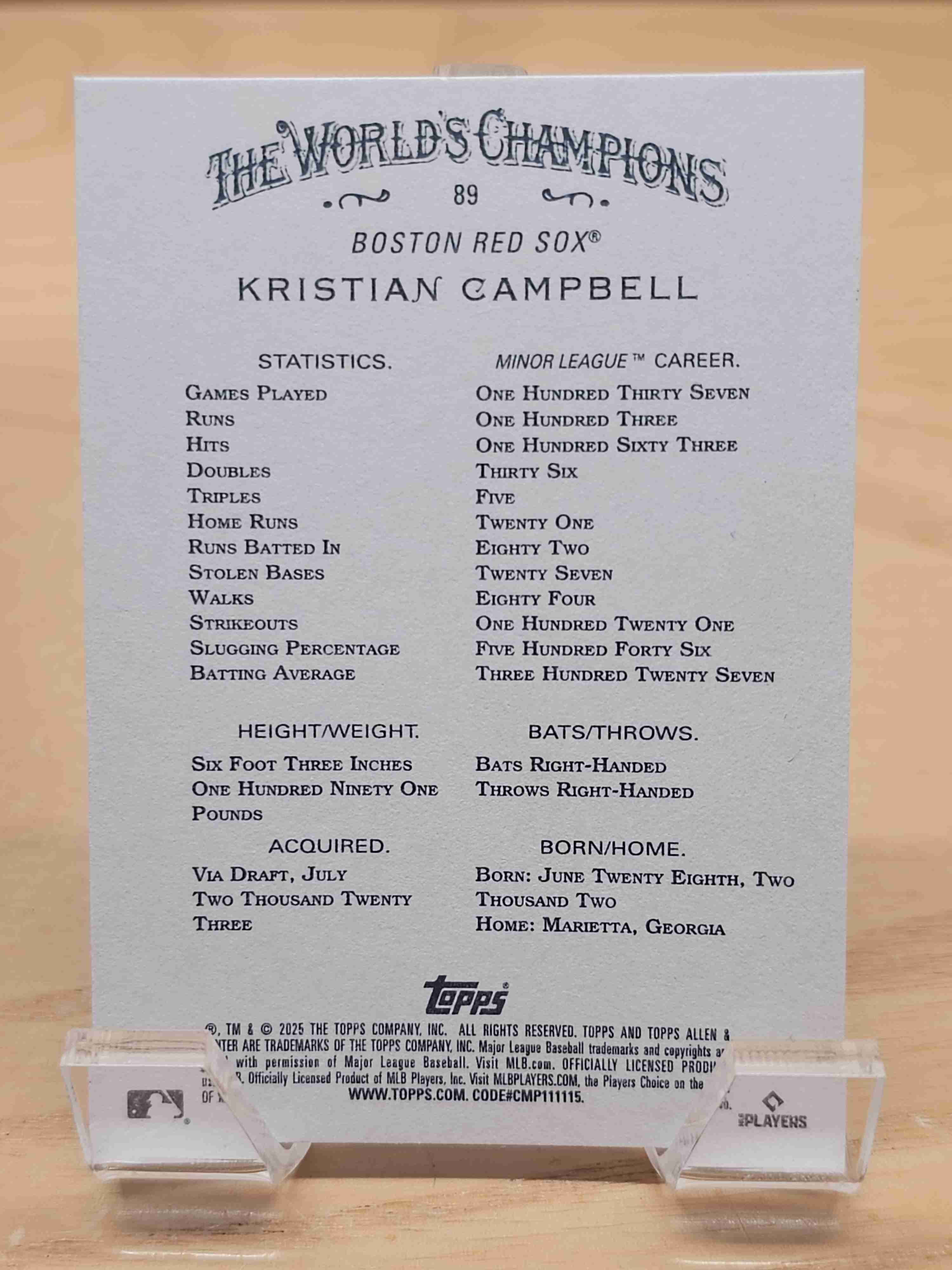 2025 Topps Allen & Ginter Baseball Rookie RC Kristian Campbell Boston Red Sox Card #89