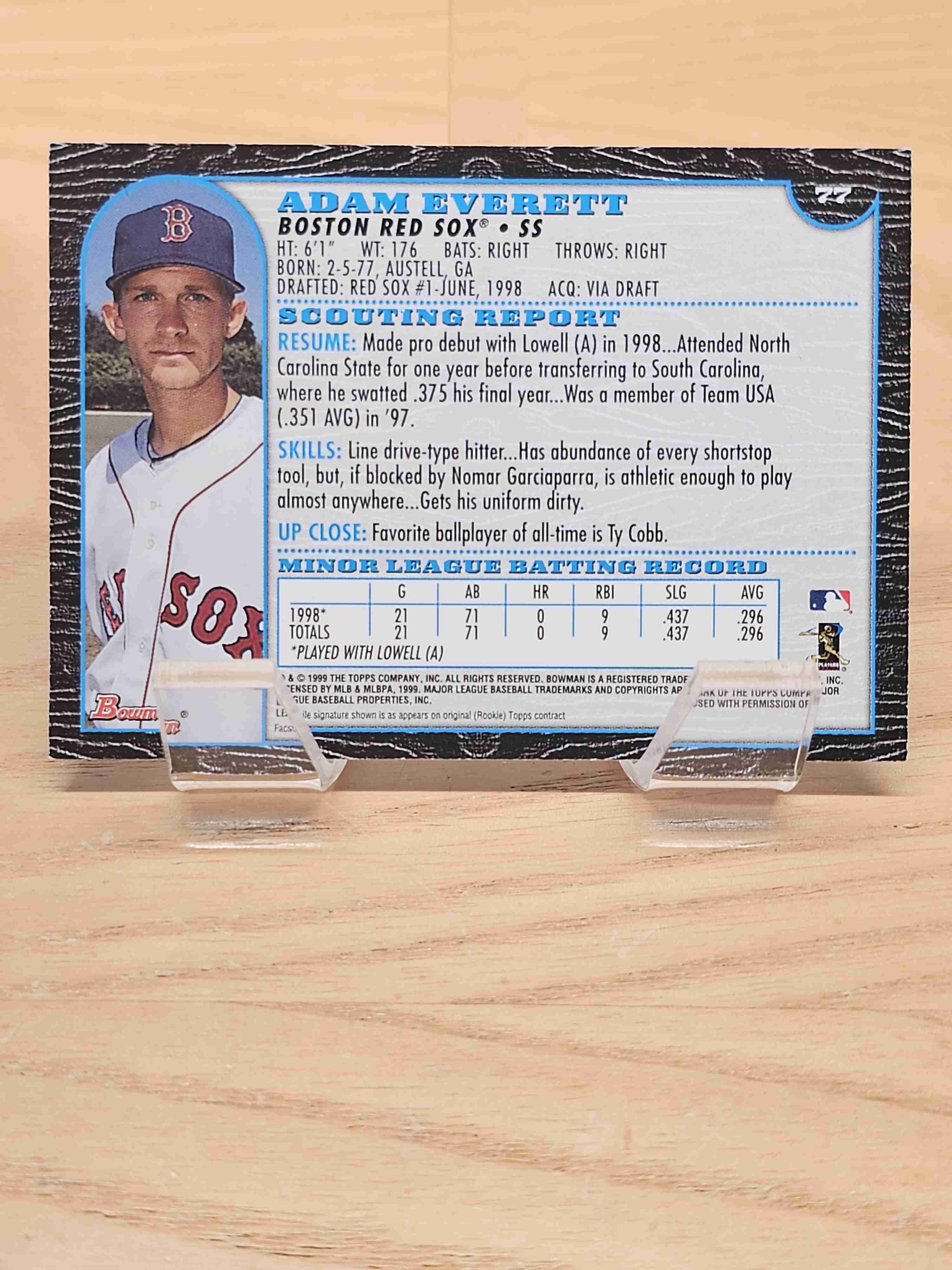 1999 Bowman Baseball Rookie RC Adam Everett Boston Red Sox Card #77