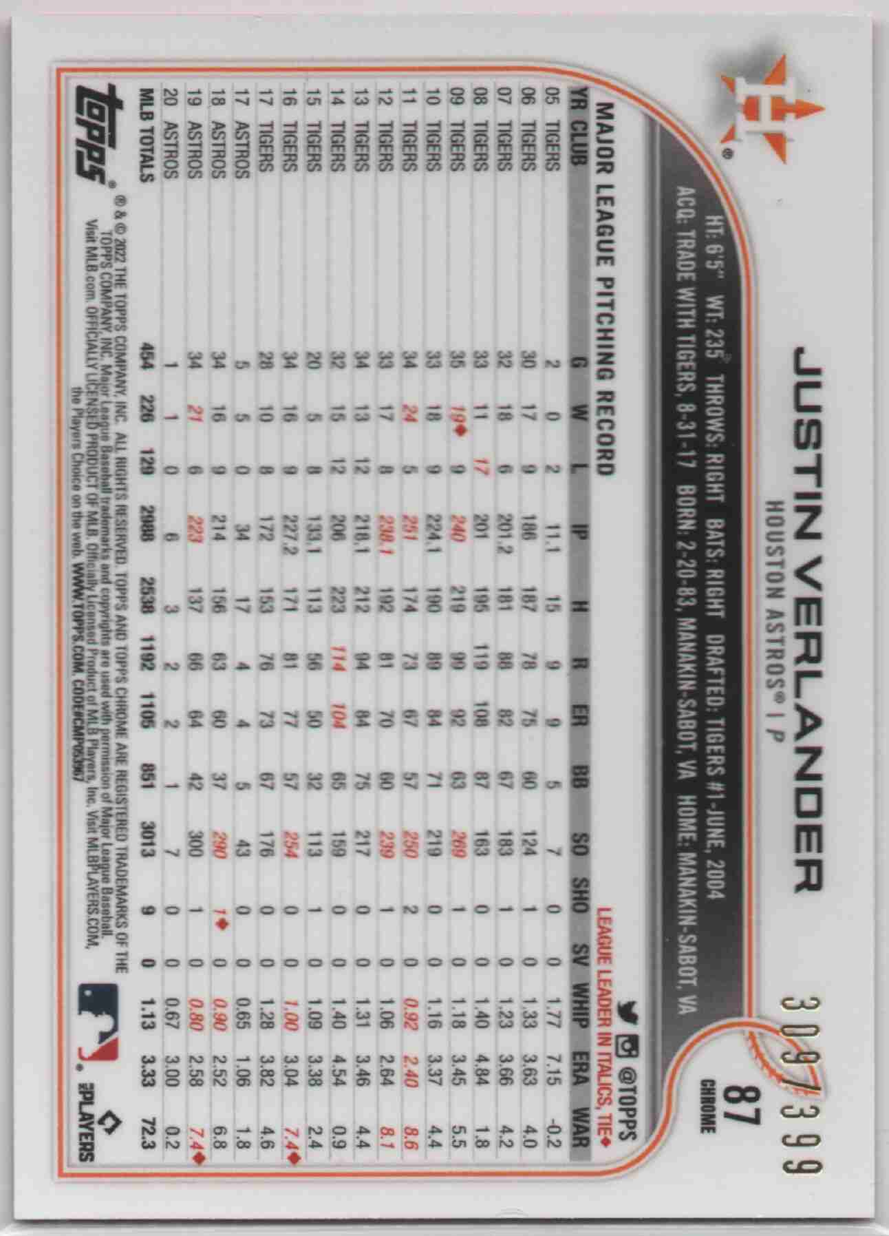 Justin Verlander 2022 Topps Chrome Pink REF 309/399