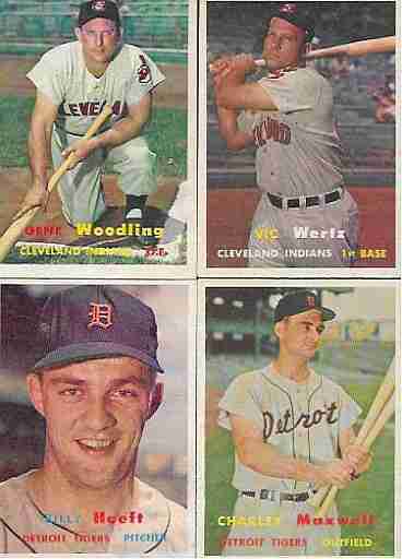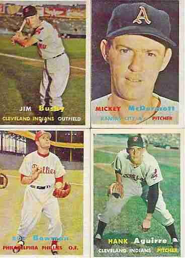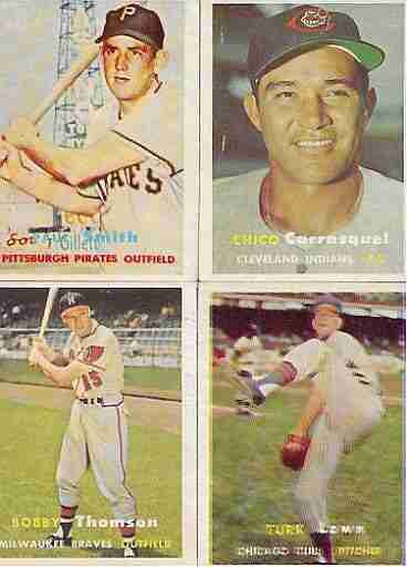Topps 1957 Baseball Lot--21 different cards. Includes 8, 60, 67, 78, 96, 134, 136, 144, 145, 172, 205, 213, 239, 247, 262, 309, 318, 332, 345, 347, 385. Average condition is EXCELLENT OR BETTER. The cards shown are representative of the entire lot.