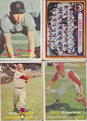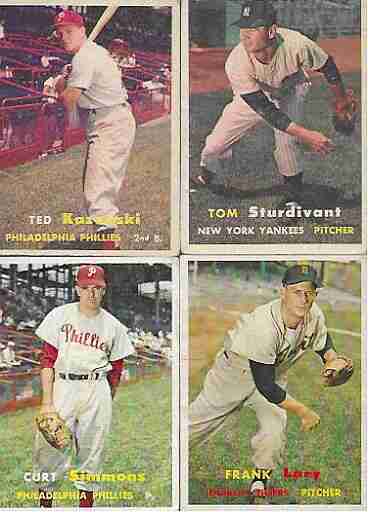 Topps 1957 Baseball Lot--26 different cards. Includes 19, 27, 34, 54, 58, 111, 119, 136,150, 148, 159, 168, 171, 176, 180, 183, 202, 206, 222, 223, 238, 248, 325, 374, 396, 400. Average condition is FAIR. The cards shown are representative of the entire lot.